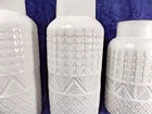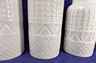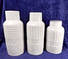 Home and Garden Textured Vases - Three Modern White/Off White Vases - Tallest measures 12.50", next is 12" and the smaller one is 9.75" - all measure 5" wide at the bottom. - All are in excellent condition, no chips, cracks or flea bites. Would look great by themselves or with some exotic flower stems. Very pretty modern design on each - all the same. I pack well from a smoke free home. Please see the other items I have on eBay. Thanks so much for looking.