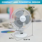 Comfort Zone 12 inch Table Fan with Adjustable Tilt, Wide Area 12", White Product Details Brand: Comfort Zone Color: White Electric fan design: Table Fan Power Source: Corded Electric Style: Classic Product Dimensions: 8.25"D x 16.25"W x 13.75"H Room Type: Bedroom, Living Room, Home Office Special Feature: Portable, Quiet Operation, Lightweight Recommended Uses For Product: Ventilating, Cooling, Air Circulation Noise Level: 55 dB Wattage: 37.2 watts Finish Type: Metal Number of Blades: 3 Air Flow Capacity: 210 Cubic Feet Per Minute Blade Length: 12 Inches Speed: 1436 RPM Voltage: 120 Collection Name: Electric Fans Switch Type: Push Button Item Weight: 4.8 Pounds Included Components: CZ121WT Table Fan, Product Manual, Cord Indoor/Outdoor Usage: Indoor Model Name: CZ121WT Specification Met: ETL Control Method: Touch Connector Type: 2-Pin Blade Material: Plastic Efficiency: 210.0 cubic_feet_per_minute Is Cordless?: No Number of Power Levels: 3 Main Power Connector Type: 2-Pin Manufacturer: Mr. Brands, LLC. Size: 12" Form Factor: Stand Alone Item Weight: 4.8 pounds Country of Origin: USA Item model number: CZ121WT Is Discontinued By Manufacturer: No Diameter: 12 Inches Finish types: Metal Care instructions: Hand Wash Assembly required: Yes Number of pieces: 1 Batteries required: No Mounting TypeController Type: Tabletop MountButton Control MaterialNumber of Speeds: Plastic3 CUSTOMIZABLE AIRFLOW: Experience personalized comfort with this oscillating fan's 3-speed controls. With easy-to-use push buttons, you can effortlessly switch between low, medium, and high speeds to find the perfect airflow for your needs. Whether you desire a gentle breeze or a powerful gust, this fan provides versatile options to keep you cool and comfortable. Enjoy complete control over your indoor environment with this convenient 3-speed oscillating fan. VERSATILE AIRFLOW CONTROL: Precise control over the direction & coverage of the airflow with this indoor fan. Featuring an adjustable tilt and oscillating design, you can easily customize the angle and range of the breeze to suit your preference. Whether you need a focused airflow for targeted cooling or a widespread circulation for a refreshing breeze, this fan can be angled, adjusted, and oscillated to create the perfect revitalizing airflow exactly where you need it. Stay cool and comfortable with the versatility of this quiet indoor fan. NOISE-FREE PERFORMANCE: Enjoy a peaceful and focused environment with this quiet office fan. Designed with a motor that operates almost silently, this fan ensures that your studying or office work remains undisturbed by any loud hum or irritating noises. Experience a tranquil atmosphere while staying cool and comfortable throughout your tasks, thanks to the quiet and efficient operation of this office fan. LONG-LASTING DURABILITY: This small oscillating table fan is designed with a strong focus on safety and durability. It features a robust metal grill that effectively shields the blades from debris, ensuring a safe and reliable operation. Built to withstand the test of time, this fan is crafted with high-quality materials to ensure its longevity and provide you with consistent airflow for years to come. Experience peace of mind knowing that your fan is not only efficient but also built to last. HASSLE-FREE ASSEMBLY: Enjoy a quick and effortless setup with this quiet room fan. Designed for your convenience, it features a user-friendly assembly process that allows you to easily attach the fan to the accompanying plastic base in just a matter of minutes. No complicated steps or tools required. Simply follow the straightforward instructions and have your fan up and running in no time. Experience the cooling comfort without any delays or frustrations with this hassle-free assembly design. Versatile 3-Speed Air Output With a three-speed air output design, this Comfort Zone 12" oscillating table fan can switch from gentle air circulation to a brisk, invigorating breeze with the push of a button. This versatile table fan offers a refreshing breeze that is suitable for hot summer days at your desk or humid nights beside your bed. Oscillating Design for Increased Air Circulation This quiet table fan is equipped with an oscillating fan head, which sways from side to side to create a gentle breeze throughout the entire room. The oscillating feature is ideal for living rooms, family movie nights and other group settings, or simply for creating a consistent breeze in a small room. Quiet Motor for Minimal Sound A great option for those who need a fan to sleep, this quiet fan for bedrooms creates very little noise, even when on its fastest speed function. It provides a gentle, consistent breeze while creating minimal sound, which can help provide relief on hot and humid nights. Adjustable Tilt for Added Control To ensure the fan is always blowing air in the direction you want, this 3-speed oscillating fan includes an adjustable tilt, which can be pointed up or down to direct the air flow with more precision. This provides steady relief from the heat on hot summer afternoons and can be used as a sleeping fan with added control over the output.