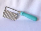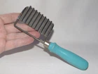 Vintage 1940s Stainless FRENCH FRY Vegetable Cutter Kitchen Tool, Aqua Handle Vintage 1940s Stainless FRENCH FRY Vegetable Cutter Kitchen Tool, Aqua Handle Click images to enlarge Description VINTAGE KITCHEN TOOL Fun vintage 1940s kitchen French fry or vegetable crimper, cutter or slicer hand tool measuring about 6-3/4" long. Featuring a turquoise/aqua blue wood handle mounted to a ribbed stainless bracket end, it is stamped simply STAINLESS on the ribbed metal. Condition is very nice with no chips, cracks, paint loss, rust or damage other than a hint of paint chipping on the handle as shown. Think this is such a neat vintage kitchen tool - unusual and fun addition to any collection or display! I f questions, please contact me - thanks! Get images that make Supersized seem small. Showcase your items with Auctiva's Listing Templates! THE simple solution for eBay sellers. Track Page Views With Auctiva's Counter