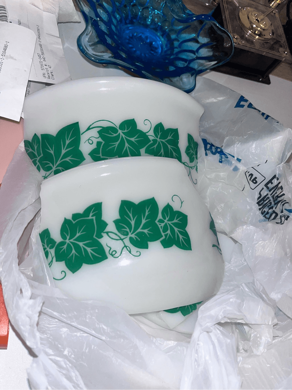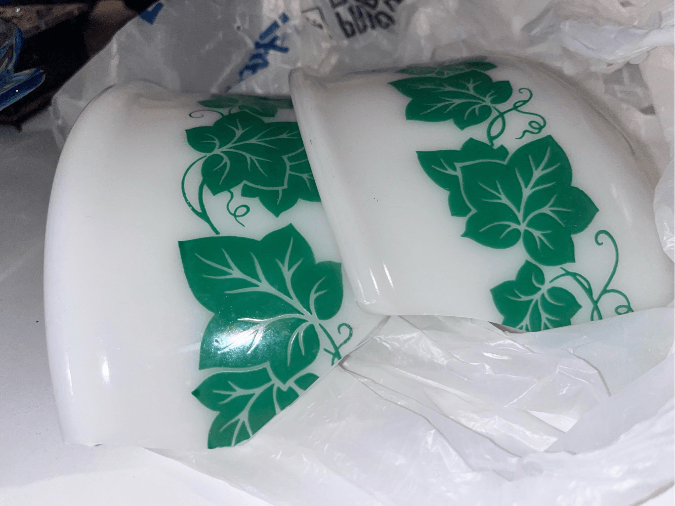My sweet Vintage Hazel Atlas bowl. It did not survive my trip. It is broken. The second bowl I've broken in a week! Anyway, is there any interest in a broken bowl? It is white with green leaves around the bowl.