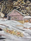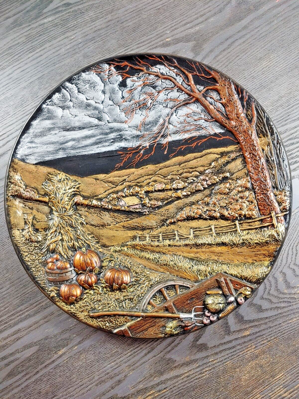 This vintage Byron Molds collector plate from 1973 features a 3D ceramic winter scene, showcasing a rustic round shape with a multicolor design. Measuring 13 inches in diameter, this decorative piece belongs to the late 20th-century era and reflects an American culture. The plate is a part of a seasonal theme, suitable for all occasions, and is a unique addition to any collector's display with its art pottery production style and vintage charm.