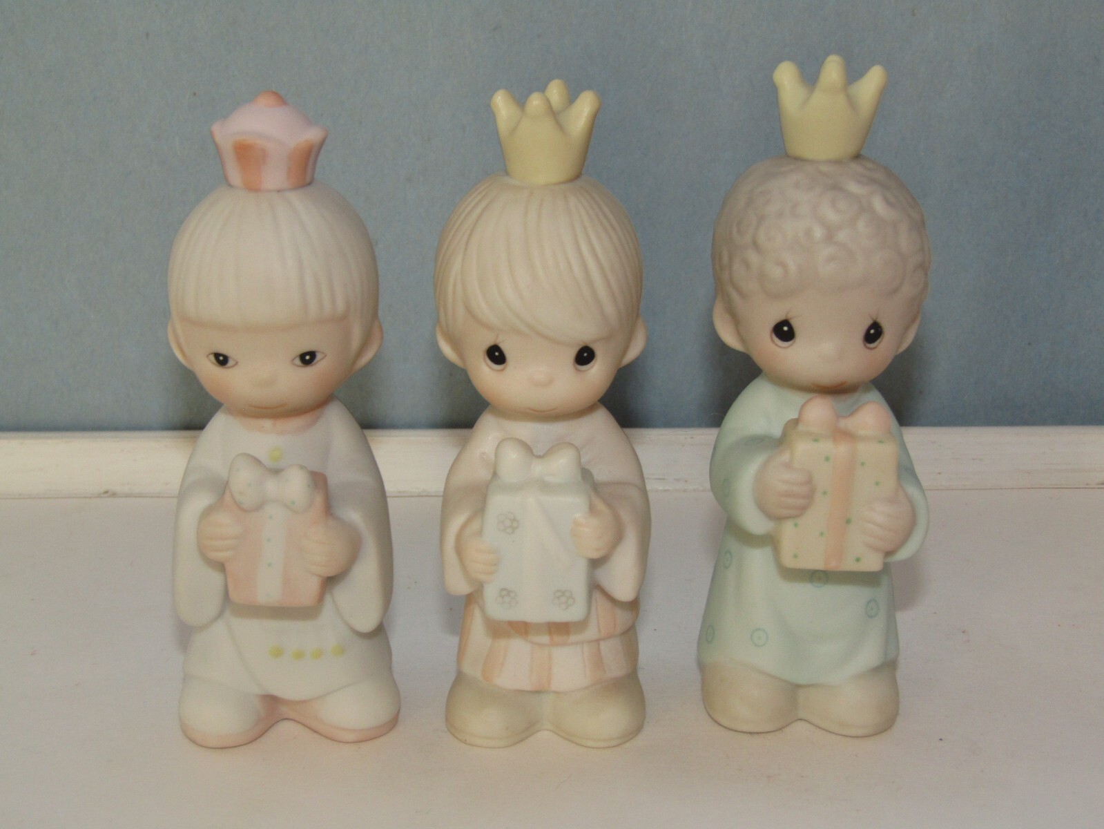 Offered in excellent, like new condition (sorry no box) is a set of three (3) Precious Moments Wisemen figurines from the 1982 Jonathan & David Enesco E2395 1982 set. Each piece is made from bisque porcelain and showcases the beloved Precious Moments characters in a multicolor design. Condition: Excellent (unboxed) condition with original labels on the underside and no damage or signs of use. They are small in size with the tallest wisemen measuring approximately 3 1/2" tall to the top of his crown. Thank you for looking and please feel free to message us if you have any questions. They will each be individually wrapped in bubble pack and fully insured against loss or damage in transit for a guaranteed safe arrival. Ships from Seattle, WA via your choice of Fed-Ex Economy with a 2-8 business day delivery estimate or USPS Ground Advantage with a 3-5 business day estimated delivery.