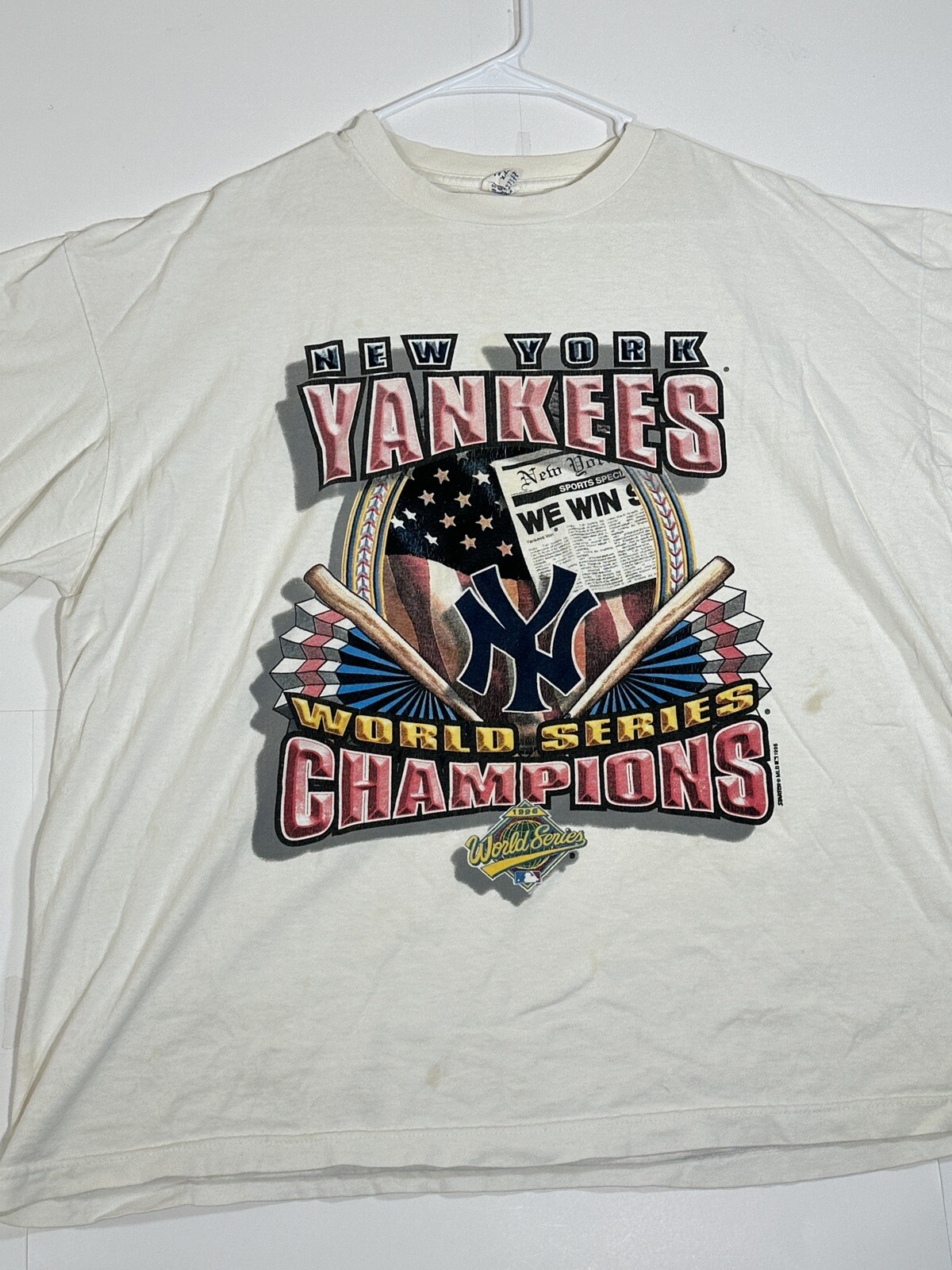 Vintage 1996 New York Yankees World Series Men's Champions Starter T-Shirt Size XL Kinda decent - to - okay condition overall - see ALL photos very closely Shirt has heavy discoloration stains/ fade throughout both sides - around collar - little stains/marks throughout front side around graphic couple little spots - back side has stain spot too - see ALL photos very closely for condition Will ship with care