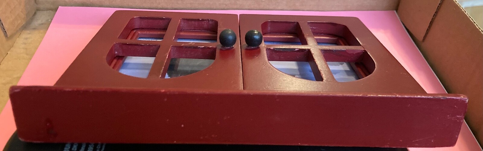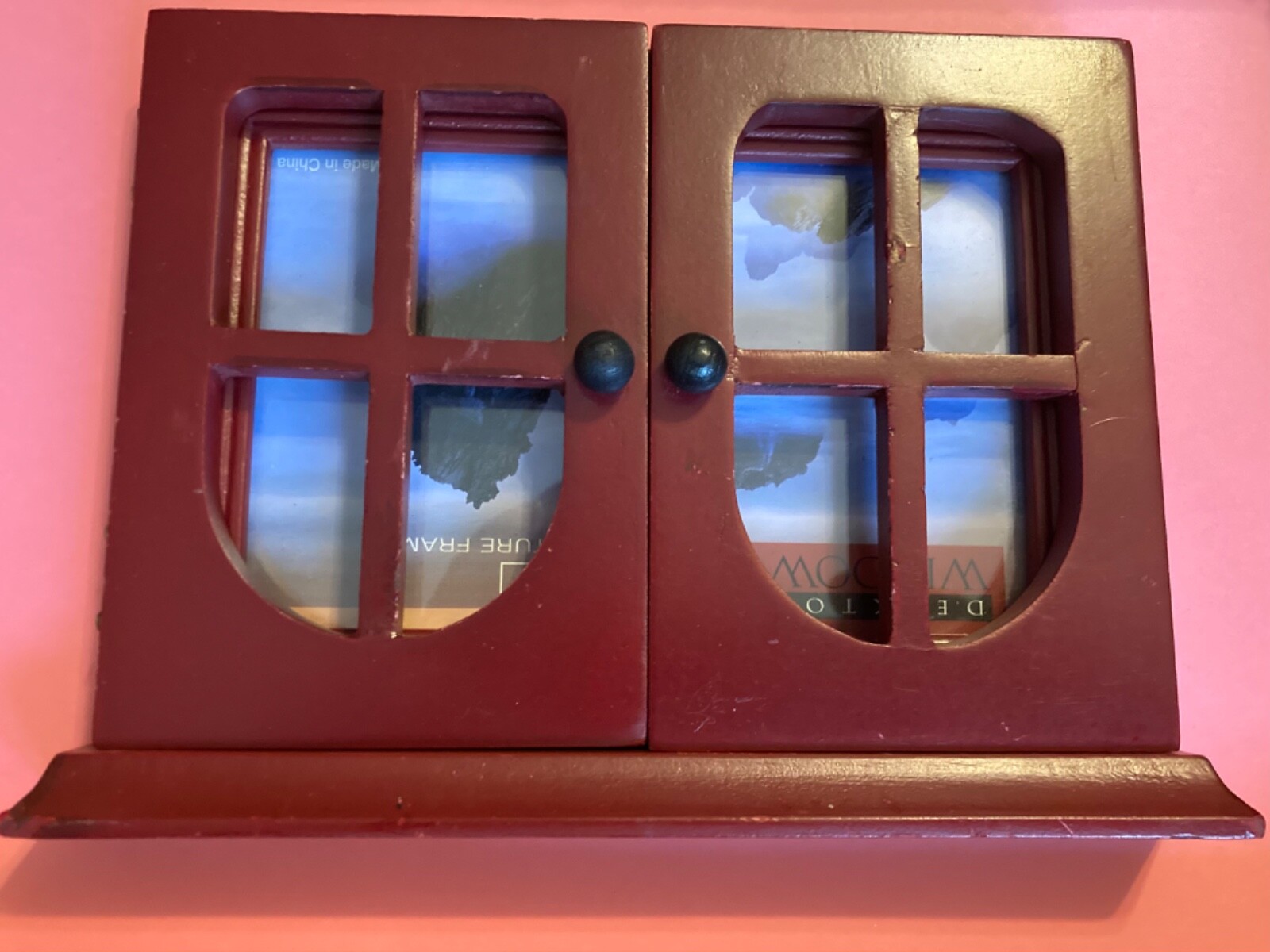 The product is a vintage 4x6 wood tabletop photo frame with a design of windows open. It has a height of 5 5/8 inches, a length of 7 7/8 inches, and a width of 1 1/8 inches. The frame is suitable for holding 4x6 inch photos and is made of wood. It would be a charming addition to home décor, perfect for displaying cherished photos. See photos for nicks and scratches