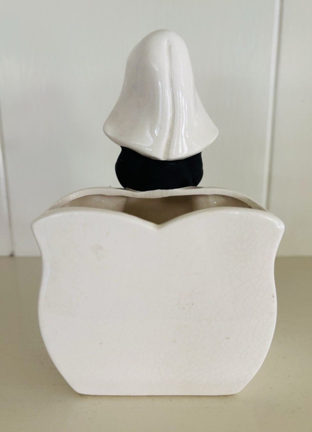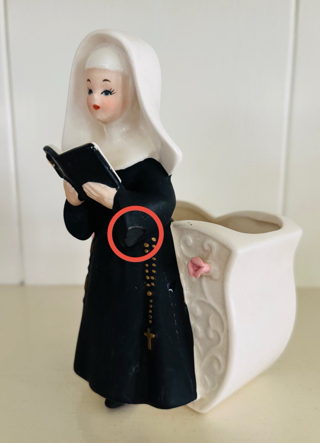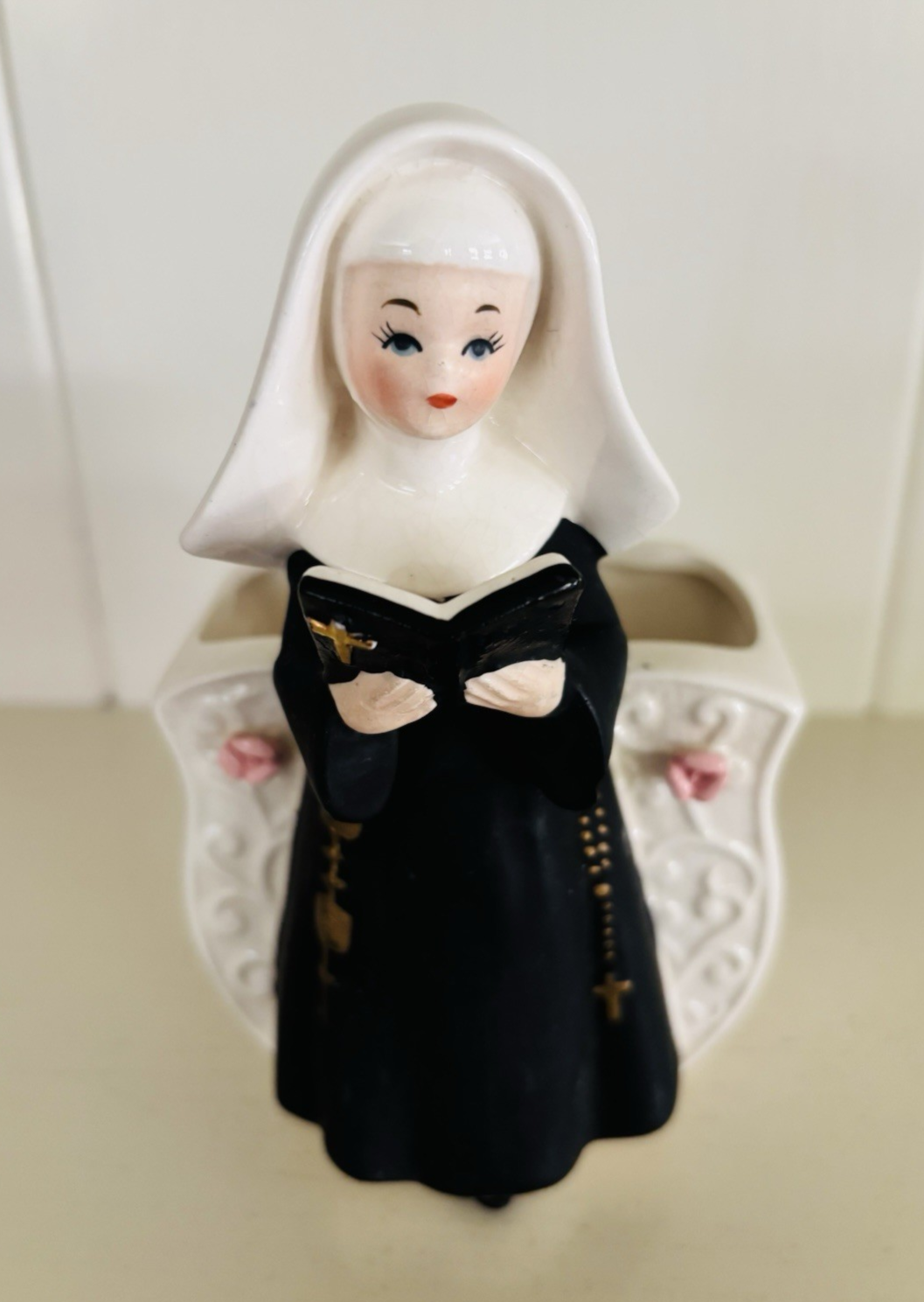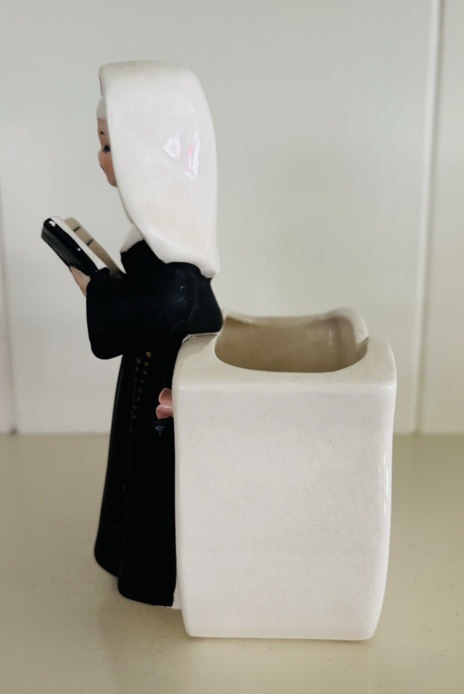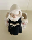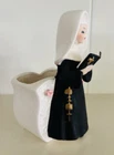 This vintage planter features a Catholic nun in a matte black habit reading from a Bible. Measuring approximately 6” x 3.5” x 3”, it is in good used condition but there is some crazing, and it appears there is a hard-to-see chip on one of her sleeves that was painted over (see pics). The ceramic flowers on the planter itself are fully intact. Just a beautiful display piece from the mid 20th century that would look lovely in any collection. Feel free to reach out with any questions. I take great care when packaging and ship within one day of purchase. Thank you so much for stopping by! **Please understand this is a vintage and/or used item that may show wear due to age and use. This could include fading, scuffs, scratches, cracks, chips, crazing, marks, nicks, paint/detail loss, etc. Please review all photos before purchasing. All items are sold AS IS.**