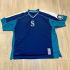 Show your support for the Seattle Mariners with this vintage 90s Majestic pullover jersey. Featuring the team's iconic blue color scheme, this unisex adult jersey is perfect for any baseball fan. The jersey is officially licensed by Major League Baseball (MLB) and is made in Indonesia with high-quality materials. With a 26-inch chest and a 21-inch collar to the bottom, this jersey is the perfect size for any fan. It's great for wearing to games or just out and about to show off your team spirit. The jersey has a capacity of 12 oz and features the Seattle Mariners team logo on the front. Get yours today and show your support for one of the most iconic teams in baseball history.