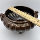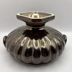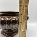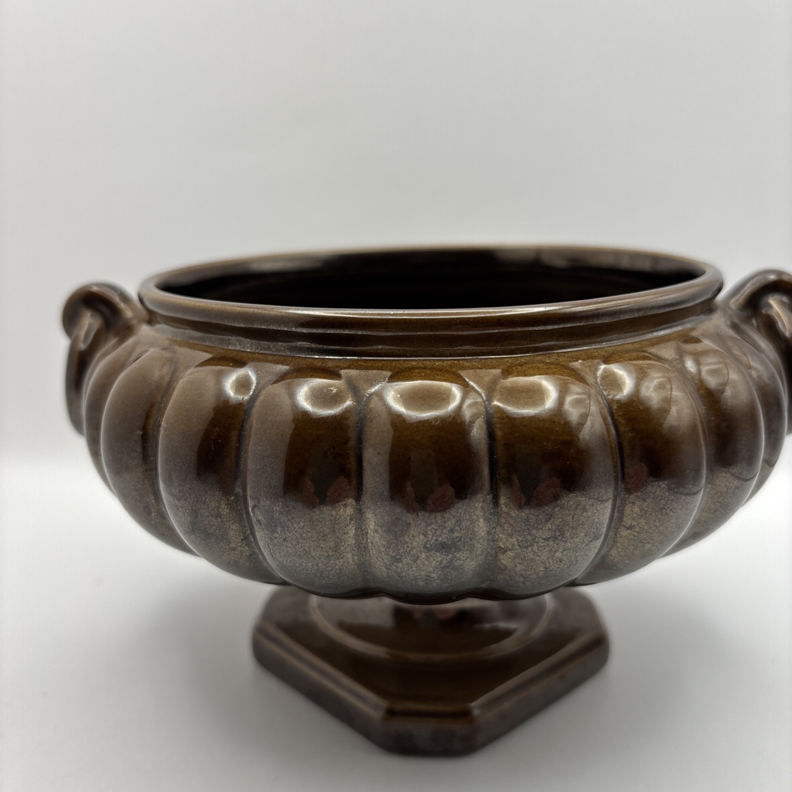 This is a ceramic pedestal planter with a shimmering bronze like glaze. It is handled. Marked on bottom. Very nice condition, no chips or cracks.