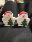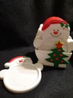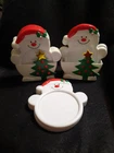 Add some festive charm to your holiday gatherings with this vintage set of 8 snowman coasters, complete with a matching holder. The colorful coasters are made of durable plastic and are dishwasher safe for easy cleaning. Perfect for protecting your surfaces during the holiday season, these coasters feature a fun seasonal theme that is sure to impress your guests. Whether you're a collector or just looking for a cute and practical holiday accessory, these coasters and holder are the perfect addition to your home bar or kitchen. Some discoloration on the back of the holder.