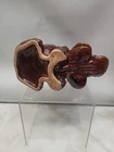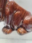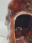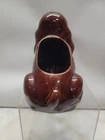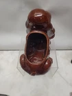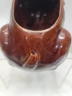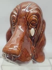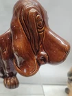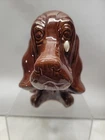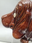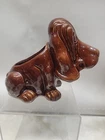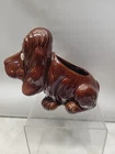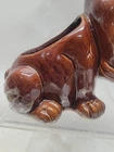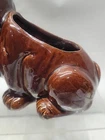 This vintage clay planter features a sad-eyed bassett hound with a tear drop faux pearl under 1 eye design. It is perfect for displaying flowers, greenery, or pens. The planter measures 7 inches in length, 5.75 inches in height, and 3.5 inches in width. The glossy finish and brown color of the planter make it a great addition to any decor. 1 small chip on front foot Wear is consistent for its age Please see the pictures