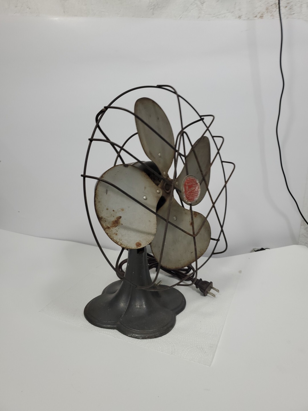 The product is a vintage Emerson Junior electric fan in model 2650 B, which features an adjustable tilt/head and oscillation. It has a gray color with an antique finish, showcasing a classic design reminiscent of its original United States manufacture. This table/desk fan is made of metal and is powered by electricity. The fan has been tested and confirmed to be in working condition, making it a functional and collectible piece for enthusiasts of vintage small appliances.