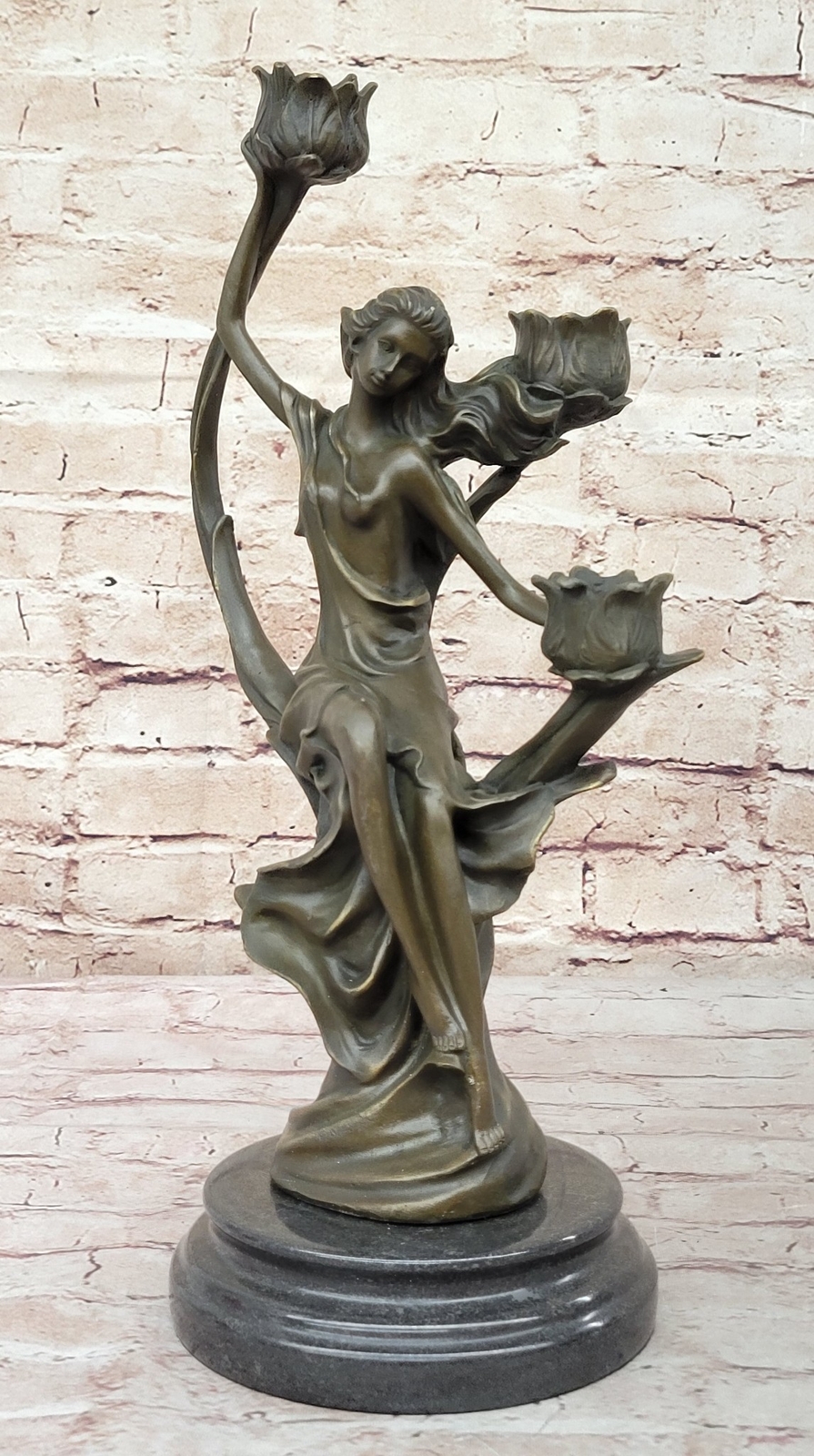 VINTAGE FRENCH EMPIRE BRASS BRONZE KASSIN CANDLE HOLDER CANDELABRA HOT CAST ART VINTAGE FRENCH EMPIRE BRASS BRONZE KASSIN CANDLE HOLDER CANDELABRA HOT CAST ART Condition : sculpture is perfect condition Bronze Dimensions with Marble Base: Height 15" X Width 9" Marble Dimensions: Diameter 5" Height without base:14" Weight:10 LBS Inventor:19YRD13115791 Experience the captivating beauty of our exquisite bronze candle holder, a stunning depiction of a woman in a moment of relaxation. With one hand gracefully behind her and wiping the sweat from her forehead, she exudes a sense of inner beauty and tranquility. Dressed in a flowing robe that elegantly hugs her legs up to her thigh, the sculpture showcases intricate details that create a sense of movement and dimension. The robe, bunching at the floor and fanning out around her, adds to the sculpture's allure, and her hips elegantly break up the form, providing the viewer with an additional dimension to appreciate. The flowers in the sculpture cleverly double as candle holders, concealing a charming surprise. Once a candle is lit and placed in the sculpture, the light reflects off the bronze, creating a breathtaking sight that adds ambiance and aesthetics to any room. This exceptionally gorgeous candle holder is not just a functional piece, but also a work of art that elevates the ambiance of your living room or home. Signed by the talented artist J. Kassin, this bronze sculpture is a testament to the artist's skill and vision, making it a prized addition to any collection or decor. Illuminate your space with the grace and elegance of this unique candle holder, turning any moment into a mesmerizing experience. Art Deco Nouveau Bronze Metal Candelabra Candleholder Sculpture Female Figure YRD-1311 bronzhaus.com Video will open in a new window Using the eBay App? Paste link into a browser window: [isdntekvideo] Shipping Terms : Most of our items are shipped via USPS (United States Postal Service) mail or UPS. Most orders are shipped within 24-48 hours of purchase. Please be aware that not all items are available for USPS shipping due to size and weight. We do ship to Hawaii, Alaska, Canada, Puerto Rico, APO/AE, and U.S. Virgin Islands, however, an additional charge may be required. Please contact us before making any purchases in these areas. For Non-USA customers, you may be responsible for all duty, tax, brokerage fees that may be due upon delivery (shipping costs cover freight charges only). We also ship internationally. Please refer to the "Shipping and Handling" chart for the rates for each area. Payment : We accept just about any form of payment. PayPal, Master Card, Visa or American Express credit cards. Money orders, cashiers checks, and even personal or business checks. For governmental institutions, we will also accept a purchase order. Please understand that for personal or business checks we have to wait for the check to clear (usually 7 days) before shipping. Condition : New Detailed Hand Crafted Hot Cast Bronze Satisfaction Guaranteed. This is Stock Photo, Slight Color Variation!! Listing and template services provided by inkFrog