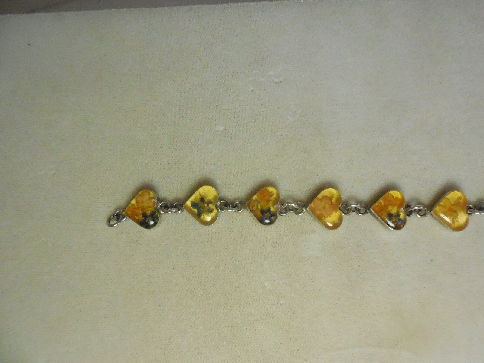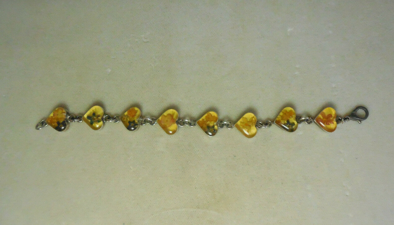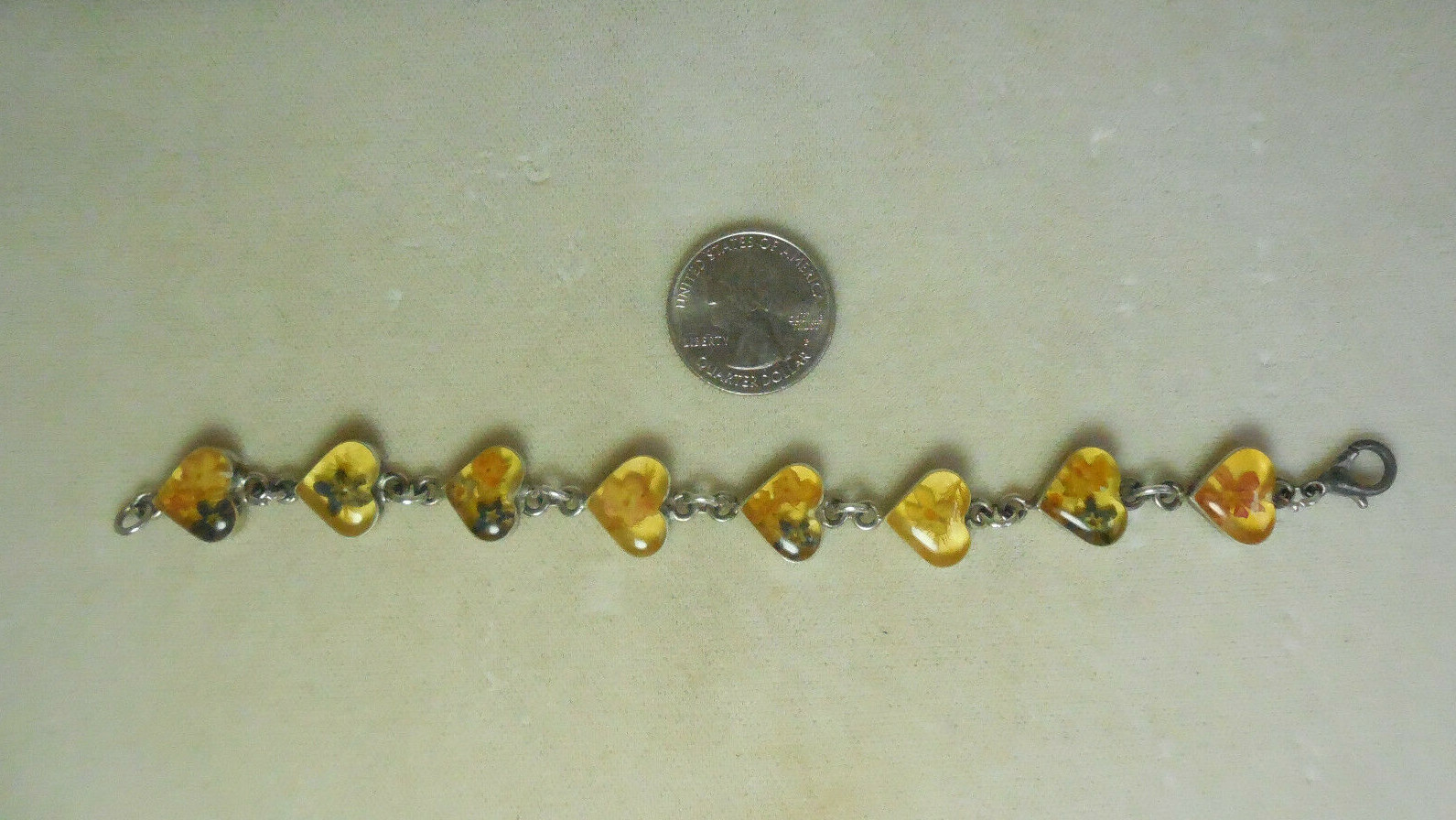Vintage Dried Flowers Under Glass Hearts Link Bracelet Description: For your consideration is this bracelet that consists of eight heart-shaped links set in sterling silver with dried flowers under glass. Marked 925 for the back of a link as seen in the seventh picture. Bracelet is about 7 inches long and compared to the size of a quarter in the fifth picture. Clean condition. Please view pictures as they accurately depict the beauty and condition of the bracelet. Tracking number will be provided. Please ask any and all questions, including requests for additional photos or shipping inquiries, before purchasing, I'd be glad to help! Thank you and happy shopping!