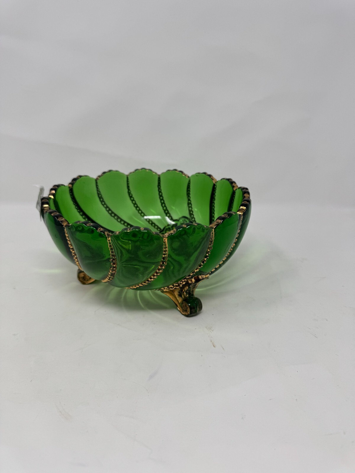 This vintage green glass footed bowl is a stunning decorative piece featuring a swirl pattern with gold accents and raised beaded detailing . The bowl sits on three ornate feet with gold-painted designs, adding an elegant touch to any space. ๐ Key Features: Material: Green glass with gold-painted details Size: 7.5โ wide x 4โ tall Condition: Excellent vintage condition with minor wear on gold detailing Perfect for: A centerpiece, candy dish, or trinket bowl Style: Victorian, Mid-Century, Bohemian A must-have for glassware collectors, vintage home decor lovers, and those who appreciate fine craftsmanship.