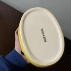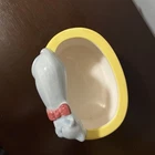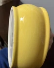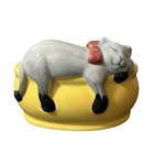 Has some crazing under the glaze, excellent condition otherwise Vintage Sleeping grey cat with red bow lying on a yellow dish. Can be a great trinket bowl or planter Ceramic Measurements: Height 4” Width 3” Length 5.5”