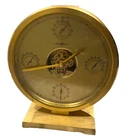 This vintage Howard Miller brass weather station clock is a stunning piece for any room. The footed round top gold gilt metal case exudes art deco mid century modern nouveau style. Measuring 9 inches tall x 7 3/4 inches wide, this clock features a barometer and thermometer hygrometer for weather forecasting. The analog display and metal dial with open escapement skeleton movement add to its beauty. The clock movement is brass mechanical or quartz battery powered ,The clock is a great and unique collectible item with original vintage features and is perfect for antique enthusiasts.