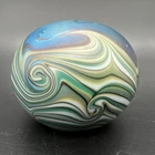 Signed Lundberg Studios art glass paperweight features an orange and purple butterfly with red stars above a swirling green and cream colored sea. 3”x2.25”