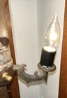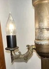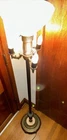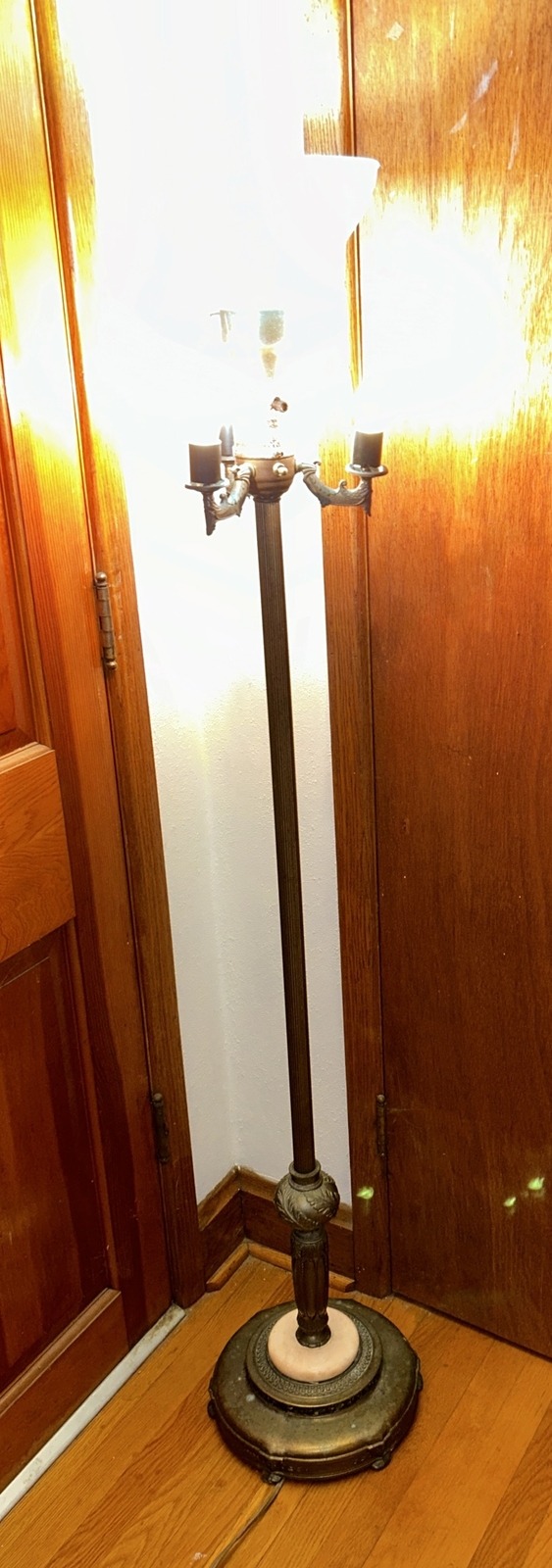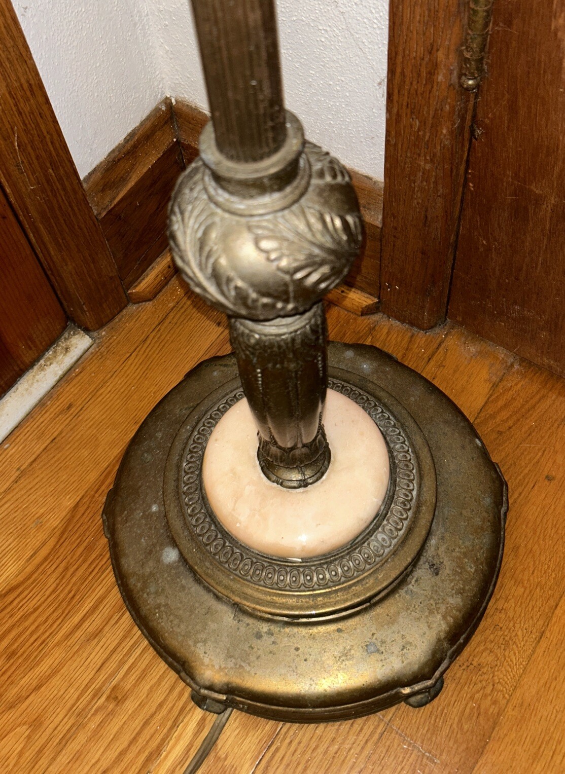 Hi, we have this great vintage floor lamp with Brass and Pink marble base and three candle light and a milk glass shade! This is a vintage pre owned floor lamp! It works well! The base is made of beautiful pink marble and brass! The head itself is a little faded and worn and could use some love! All of the lights work! This lamp has the larger socket for the big bulbs! It will not come with a bulb! But it has been tested and it works well! They make an adapter to work with regular bulbs! Please check out the pictures and ask all questions before you bid! Thanks for checking out our STUFF!