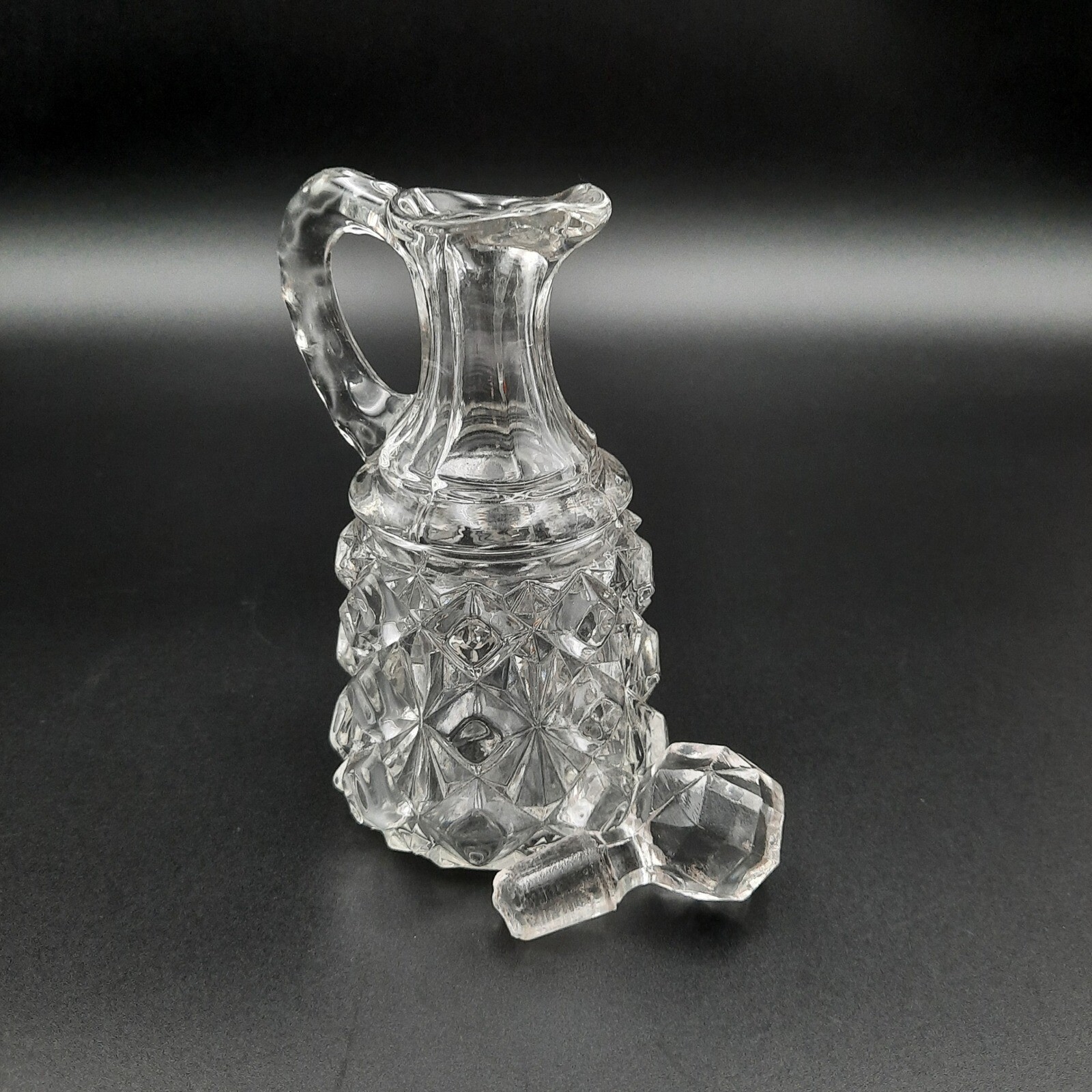 This vintage manganese glass cruet features a striking cut diamond pattern and an intricately faceted stopper. Under UV light, it emits a subtle green glow, a hallmark of manganese glass. The cruet is in good vintage condition, with charming signs of age and light wear consistent with use. The clear, thick glass design showcases beautiful craftsmanship. Approximate height: 6". Material: Glass Set Includes: Vinegar Cruet, Oil Cruet Type: Oil/Vinegar Cruet Color: Clear Number of Items in Set: 1 Keywords: vintage decanter, glass pitcher, diamond cut glass, oil decanter, vinegar cruet, vintage glassware, decorative decanter, kitchen decor, table setting, glass bottle, stopper, diamond pattern, clear glass, vintage kitchen, antique glass
