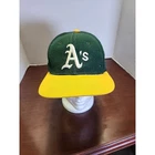 Show your team spirit with this vintage Oakland A's baseball cap in green and yellow. Ideal for fans and collectors alike. • Green cap with yellow brim • Embroidered A's logo on front • Adjustable fit • Vintage design Minor wear and small holes on the back and side.