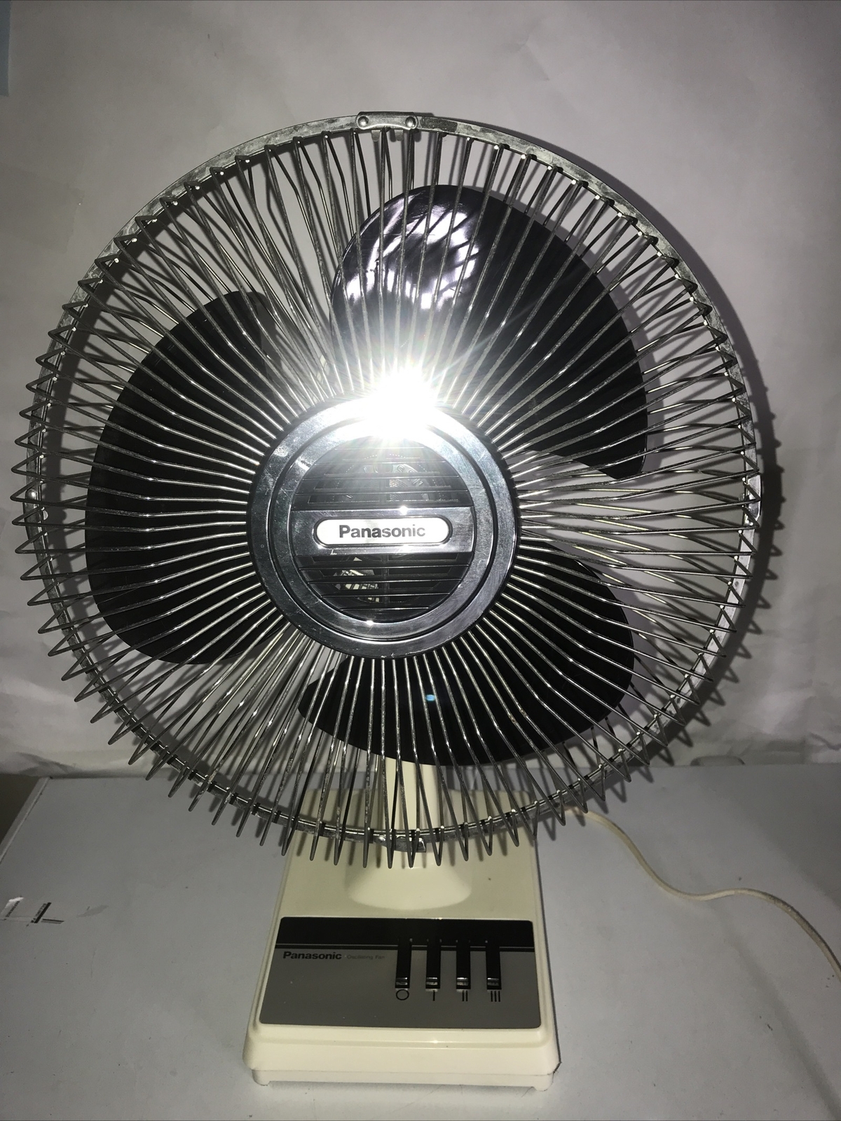 Vintage Electric Fan Oscillating Panasonic F-1209 Translucent Blade 3 Speed. Minor crack on blade ( see photos). Does not effect use. Tested and in working condition. Please view the entire photo array.