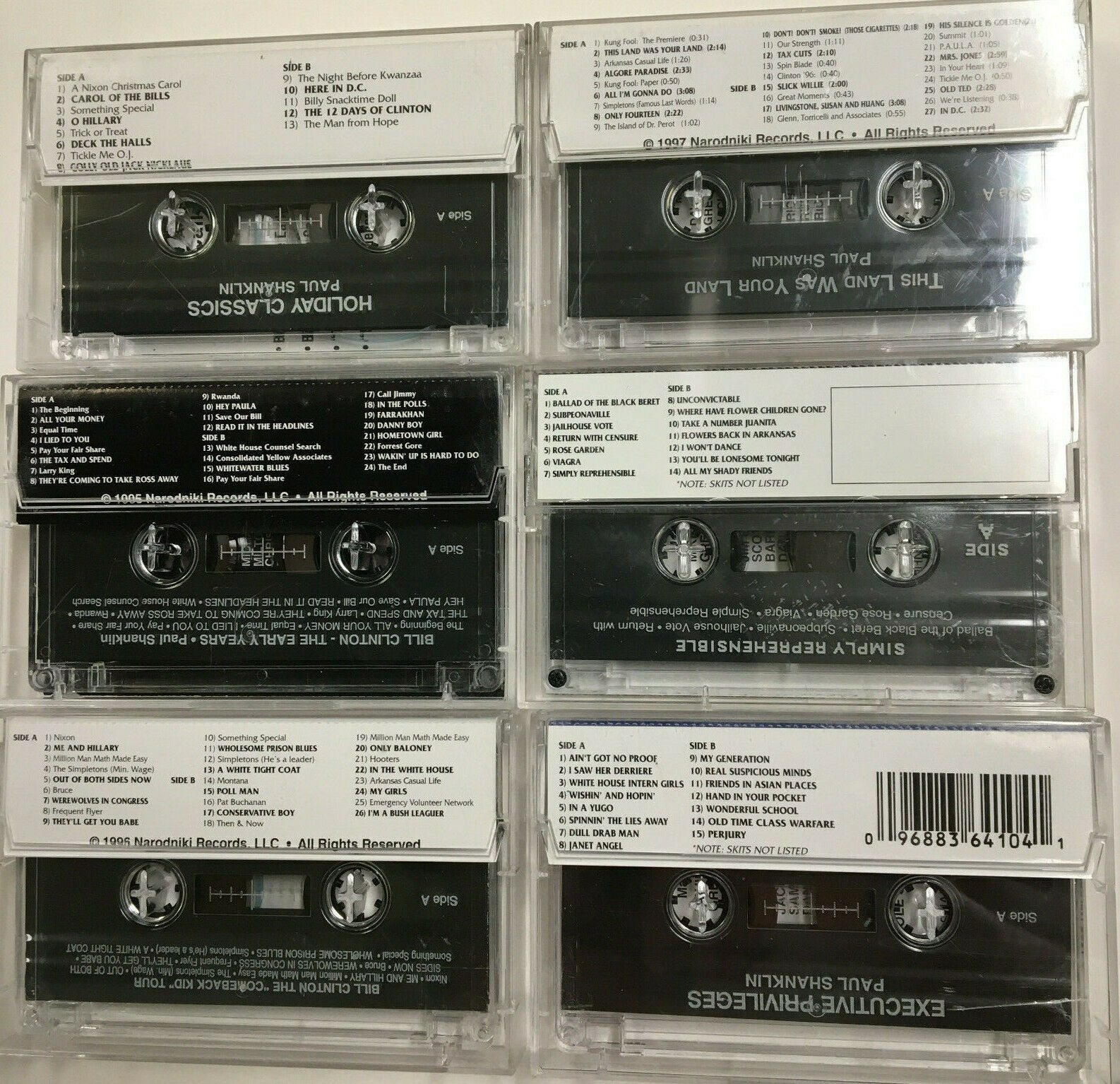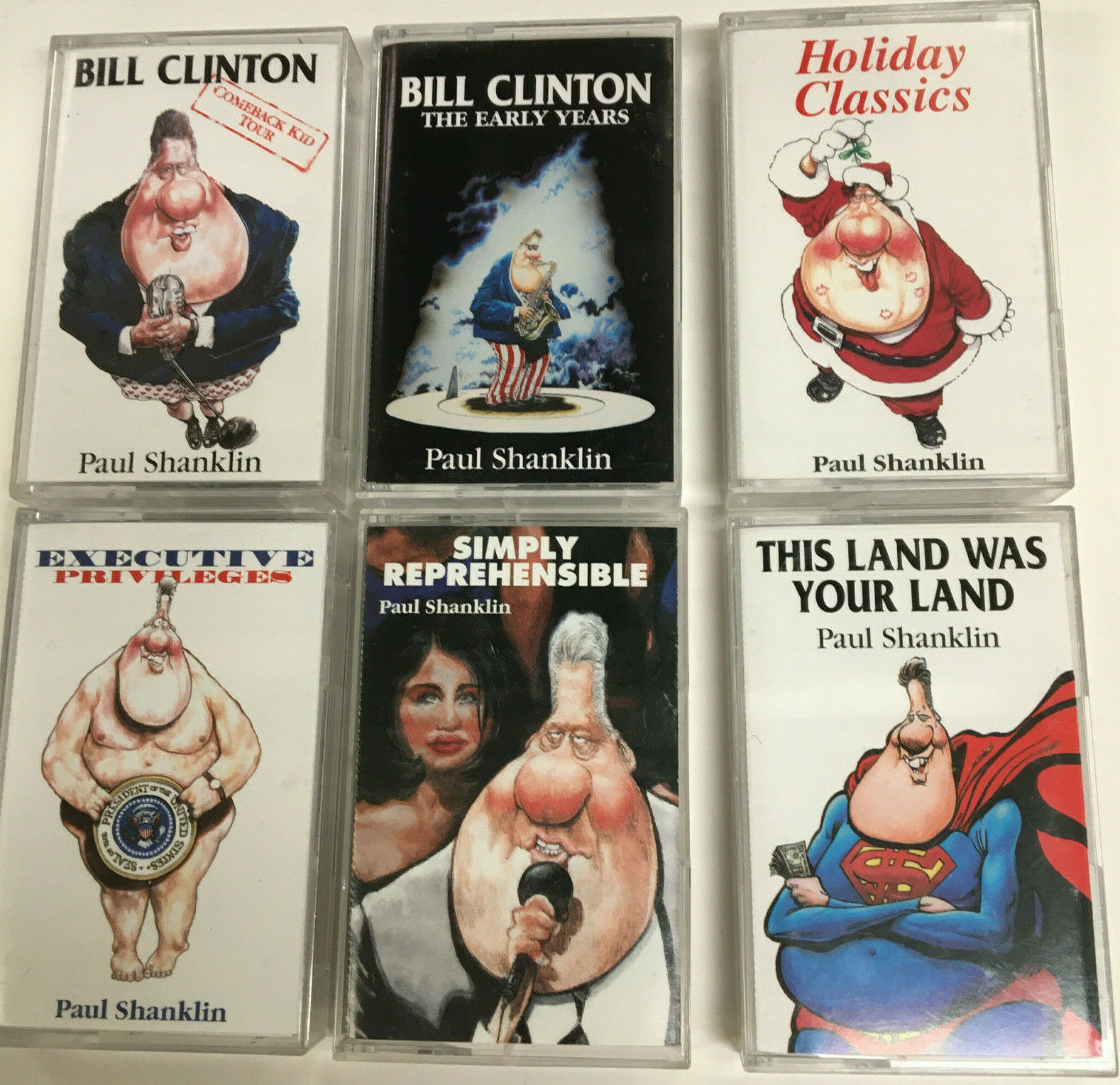 Vintage Paul Shanklin LOT of 6 Audio Cassette Tapes Political Satire from the 1990s, promoted by Rush Limbaugh Executive Privileges Holiday Classics Simply Reprehensible Bill Clinton The Early Years Bill Clinton The "Comeback Kid" Tour This Land Was Your Land (Use close-up on photo #3 to view individual song titles) Cassettes appear gently used, clean, and shiny, not all are rewound, none are tested (I don't have a cassette player), Side A cassette surface of Simply Reprehensible has what may be an unintended factory-machined scuff pattern (use close-up on last photo) Cases are all intact and clean, with varying degrees or surface wear, back of Executive Privileges has a one-inch crack Free shipping via USPS Media Mail Delivery could be late due to possible carrier delays