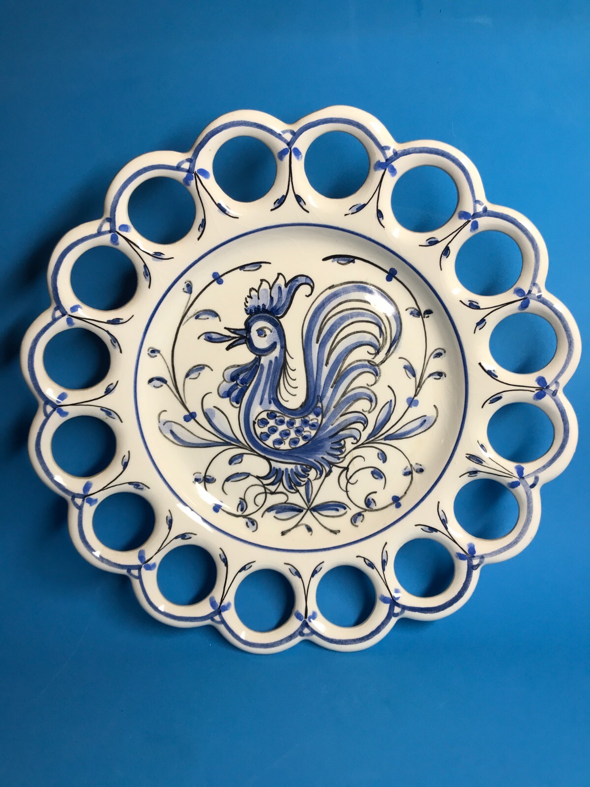 FROM MADEIRA WITH LOVE.... Found in an estate liquidation on the island of Madeira in Portugal, that of a retired antiques dealer. Vintage Portuguese pottery wall plate. A classic blue and white hand painted image of a rooster is the center motif. Finished with a scalloped open work rim. The rooster has been considered the unofficial mascot of Portugal for decades. Found in a wall display of antique and vintage plates, It has survived free of chips or cracks, no abrasions. The plate measure 8 inches in diameter and has a pierced back rim making it easy to hang without a plate holder. I inserted a standard size playing card in one photo as a reference for size. MUCH OBLIGED