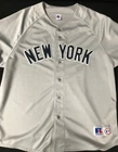 For sale is a vintage Russell Athletic New York Yankees jersey in road gray. This jersey features the iconic pinstripes and is in like new condition. It's a size XL and perfect for any baseball fan. This jersey is officially licensed by the Major League Baseball (MLB) and made for men. Whether you're a collector or want to show your team spirit, this jersey is a great addition to your wardrobe.
