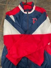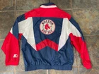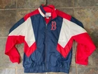 This is an excellent Starter Genuine Merchandise Boston Red Sox jacket. Lightweight windbreaker style in red, white, and blue. Embroidered logos front and back. Full zip. Excellent vintage condition. Very minor wear. Zipper works great. Always happy to combine shipping when possible. Thanks for looking!