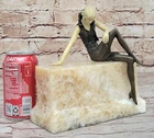 Vintage Theatre Actress Bronze Statue Dancer Nude Jazz Singer Classic Figure Art Vintage Theatre Actress Bronze Statue Dancer Nude Jazz Singer Classic Figure Art Condition : This sculpture is in perfect condition. Bronze Dimensions with Marble Base: Height 8" X Width 8" Marble Dimensions:8" X 3 1/2" Height without base:7.5" Weight:10 LBS Inventory:61XQ0074616 Sculpted in a captivating pose that exudes both confidence and allure, this bronze sculpture captures the essence of a young woman embracing her femininity with boldness and elegance. With her long, curvy legs on display in a short, tight mini skirt, she commands attention and stirs envy among other women while eliciting desire from men drawn to her undeniable beauty. As a symbol of feminism, the woman depicted in the sculpture wields tremendous power through her captivating presence, effortlessly captivating those who gaze upon her with nothing more than a glimpse of her golden skin. Her figure embodies strength, independence, and self-assurance, serving as a testament to the allure of feminine allure and empowerment. Crafted using the ancient lost-wax casting method, this handmade bronze sculpture showcases exquisite craftsmanship and attention to detail. The brown patina finish adds depth and character to the piece, while the choice of mounting it upon a beige onyx base enhances its aesthetic appeal. Though the sculpture's body is made of bronze, the hand and face are crafted from resin, allowing for greater precision and detail in capturing the delicate features of the subject. Bronze Sculpture Sexy Model Posing Bronze Hot Cast Classic Artwork Figurine Gift www.bronzhaus.com Video will open in a new window Using the eBay App? Paste link into a browser window: [isdntekvideo] Shipping Terms : Most of our items are shipped via USPS (United States Postal Service) mail or UPS. Most orders are shipped within 24-48 hours of purchase. Please be aware that not all items are available for USPS shipping due to size and weight. We do ship to Hawaii, Alaska, Canada, Puerto Rico, APO/AE, and U.S. Virgin Islands, however, an additional charge may be required. Please contact us before making any purchases in these areas. For Non-USA customers, you may be responsible for all duty, tax, brokerage fees that may be due upon delivery (shipping costs cover freight charges only). We also ship internationally. Please refer to the "Shipping and Handling" chart for the rates for each area. Payment : We accept just about any form of payment. PayPal, Master Card, Visa or American Express credit cards. Money orders, cashiers checks, and even personal or business checks. For governmental institutions, we will also accept a purchase order. Please understand that for personal or business checks we have to wait for the check to clear (usually 7 days) before shipping. Condition : New Detailed Hand Crafted Hot Cast Bronze Satisfaction Guaranteed. This is Stock Photo, Slight Color Variation!! Listing and template services provided by inkFrog