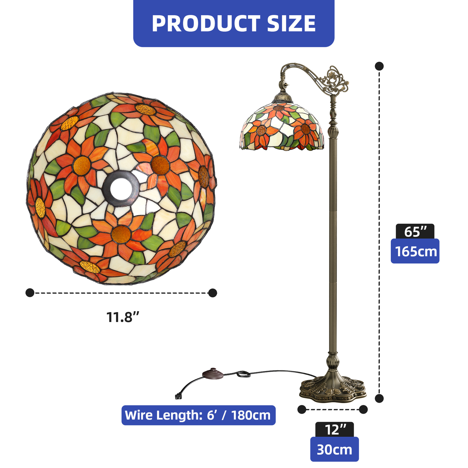 Vintage Tiffany Floor Lamp with Flexible Gooseneck & Floral-Stained Glass Shade Product Description NOTE: Professional Installation Would Be Highly Recommended. Description : 1. Rod Color: Antique Copper 2. Lamp Shade Color: Flower Pattern Shade 3. Materials: Metal & Glass 4. Room Type: Bedroom, Living Room, Home Office/Study Room, Family Room, Entertainment Room, Reading Nook, Sunroom. 5. Feature: Flexible Lamp Shade Angle with 90° Rotation, Stained-Colored Glass Shade, Pedal Switch, Durable Reinforced Base, Gentle Light, Bulb & Switch Not Included, Corrosion-Resistant Base, Sturdy Metal, Suitable for Various Settings, Compatible with All E26 Bulbs, Max Wattage: 60W, Easy to Assemble, Easy to Clean. Features: 1. Rotatable Lamp Design: The lamp boasts a ball-shaped joint enabling a 90-degree rotation , suited for targeted lighting needs. Its stained glass shade, adorned with a floral pattern, offers both practical illumination and a stylish accent to any room. 2. Feature-Rich Lamp: This lamp includes an E26 bulb socket capable of accommodating up to 60 watts , designed for various lighting requirements. It features a stable, reinforced base and a pedal switch for easy operation. 3. Dynamic Lighting Effects: The lamp demonstrates its utility whether illuminated or not , showcasing the rich colors and intricate details of the stained glass. This dual functionality enhances its visual appeal in different lighting environments. 4. Proportional Design Elements: Standing at 65 inches tall with an 11.8-inch shade diameter, the lamp is ideally proportioned for large spaces or rooms with high ceilings . It comes with a 6-foot cord , offering considerable flexibility in placement relative to power sources. Dimensions: 1. Overall Dimension: 12"W x 65"H 2. Lamp Shade Dimension: 11.8"Ø Package Included: 1. 1 x Floor Lamp 2. 1 x Accessory Kit 3. 1 x Instruction Manual Note: 1. During assembly, do not tighten screws until all holes are aligned. 2. Confirm the appropriate furniture size for your needs prior to purchase. 3. There may be a slight color discrepancy between the product as seen on your monitor versus in real life. 4. Do not expose the product to extreme sunlight. To extend product lifetime, cover when not in use. 5. Contact us immediately if any components are missing or damaged upon arrival. Our customer service team will resolve your issue right away . Shipping 1. Normally the item will be dispatched within 1 business day if payment is cleared before 12 pm PST. 2. Please verify the correct shipping address in your PayPal account before making the payment. We only dispatch the item to the address that is sent to us at the time of checkout. 3. We don't ship to Hawaii, Alaska, Puerto Rico, APO/FPO/PO Boxes. 4. We don't provide local pick-up service. 5. Normally we will use USPS, UPS, FedEx & LTL to dispatch items. Payment 1. We accept PayPal and credit card. 2. We will ship to the confirmed Paypal shipping address that is provided with the payment only. Return 1. 30 days Money Back Guarantee. 2. Please contact our customer service to receive a RMA form first if want to return the item. 3. All returned items MUST in new condition with the original package. Contact If has any problem, please contact us by sending an ebay message. Our customer service will resolve the problem as soon as possible. On Mar 4, 2025 at 20:52:02 PST, seller added the following information: