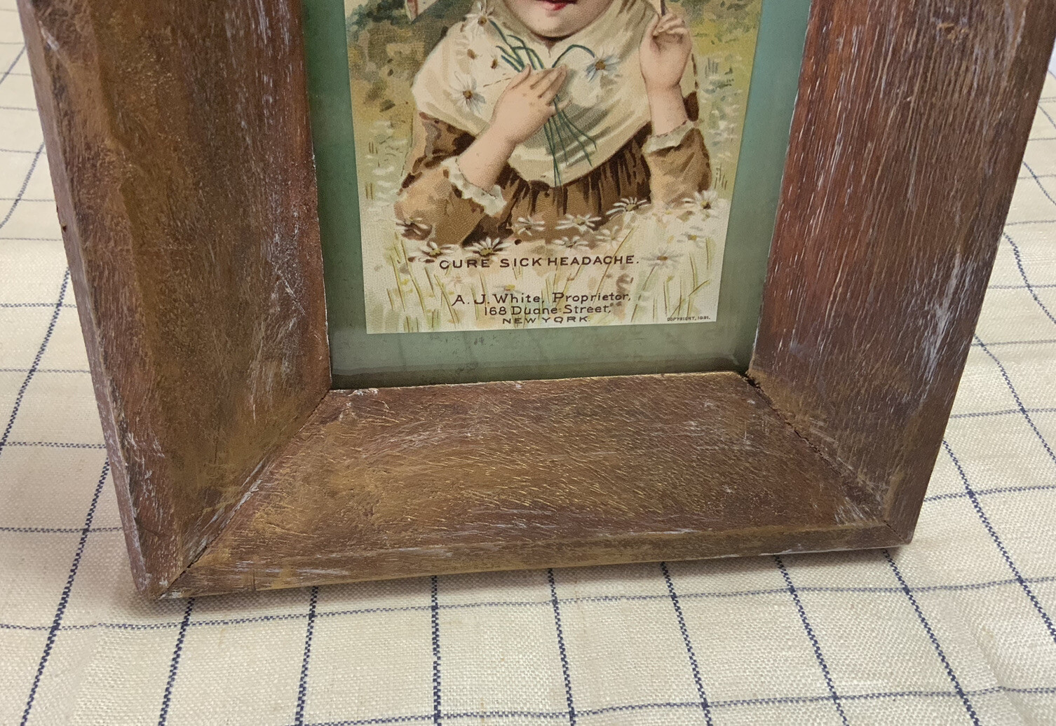 Up for sale is a vintage/antique framed Victorian trade card. This trade card design is Young lady with hat. Advertising Shaker Family Pills - cure Sick Headache. NY. From the early 1900’s. The frame is wood - dark brown distressed finish. With glass. The colors are aqua, brown, flesh, beige, red, blue, multi. Measures 6 3/4” by 8 3/4”. Very, very nice Victorian art. Thanks and happy shopping. I will combine shipping. Please visit my ebay store: webbsamericancounry1 for over 2000 vintage and collectible items.