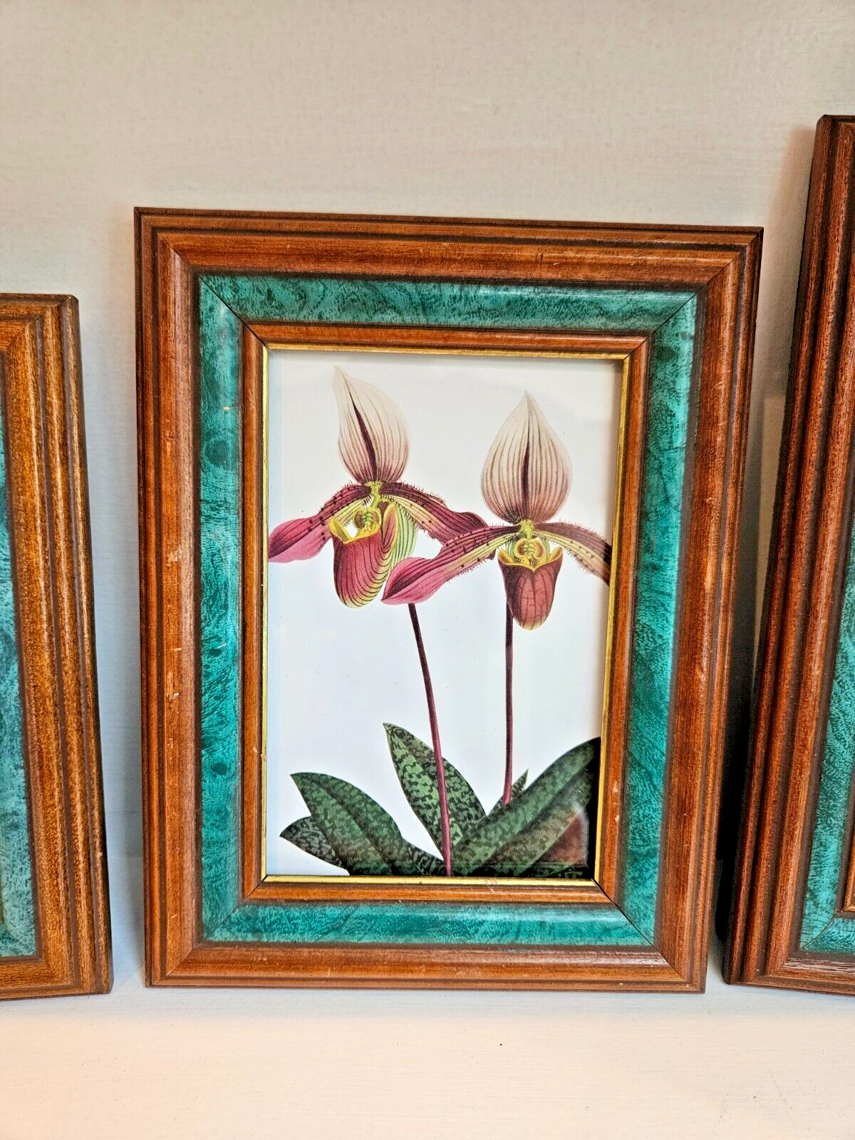 This vintage picture frame set by FETCO is a rare find. The set includes three rectangular frames made of wood with 3 beautiful botanical prints in a gold, green and brown wooden frames. The frames are designed to be wall mounted, and 2 of them can stand. One does not have the stand (the 4x7 frame) and can hold up to three photos, one photo each.The ornate features of these frames make them a perfect addition to any art collection. The set has a 1980s style and was manufactured in China during that time period. Within the frames currently are 3 rare botanical prints of the orchid family. These pictures and be enjoyed, or replaced, easily. This frame lot is a must-have for collectors and will add a touch of elegance to any room. 3x5, 4x6 & 5x7
