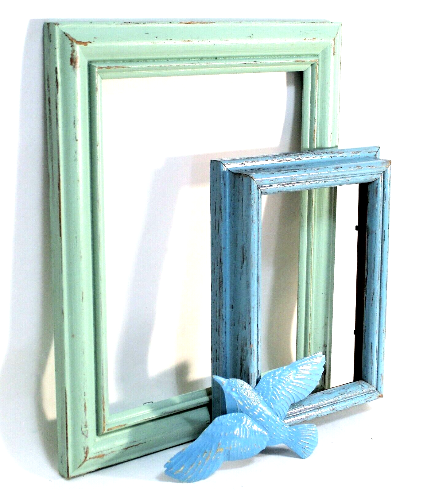 Collection of 4 (& Bird)...…...Vintage Picture Frames / Solid Wood / Empty Open Frames / Painted Aqua, Blue, Mint & Green / Blue Metal Bird........ olive green - 17 1/2" x 8" (view-15"X6") // aqua mint -12 1/2" x 10 1/2" (view=10"X8") // slate blue with print - 9 1/4" x 7 1/2" (view-7"X5") // aqua - 8 1/2" x 6 1/2" (view=7"X5") // 7" x 3" - blue bird ................Please email with questions...........Thank You!!!