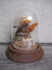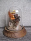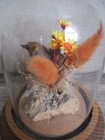 1970's small dried flowers decoration, under glass with a wooden base.4 5/8" tall. Base is 4 1/8" wide. Very good condition.