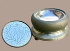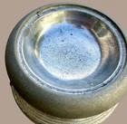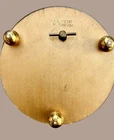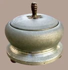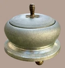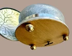This vintage powder box is a beautiful addition to any collection. The blue metal exterior is accented with brass ball feet on the base and finial on the lid. The box has a crackle design mirror inside the lid, making it perfect for storing makeup or other small items. The box is in excellent working order and has been well-maintained. It was made in the United States with US Pat. No. 2,009,904. This is a great find for collectors of vanity pieces. 5” diameter x 4 1/2” tall. Wt. 13.7 oz. Shipped USPS Ground Advantage