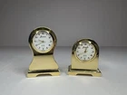 The "Vtg Jacmor Quartz Small Clocks" are vintage novelty clocks from the late 20th century, specifically designed with a quartz movement powered by batteries. These small clocks feature an analog display in a gold-colored metal casing, reflecting the unique style of the Jacmor franchise. Made in China, these clocks cater to collectors and enthusiasts of decorative timepieces, offering a blend of vintage charm and functional timekeeping through their quartz-powered mechanism. DISCLAIMER****NEEDS BATTERIES****