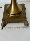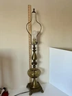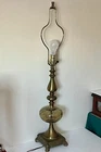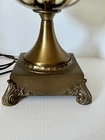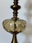 Vintage Brass table lamp with transparent brown art glass globe Original harp finial and cord. Three- way switch/ working Lamp 24” base to socket total = 34” tall w harp & finial weight 5 lbs 8 oz Brass shows patina signs of aging otherwise there are not any dents chips bending looseness or damage original owner estate find See photos Thank you