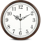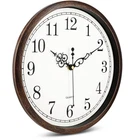 10 inch vintage wall clock. Large black bold numbers and black dial against white face creates easy viewing. Precise quartz movements guarantee accurate time Silent non-ticking mechanism with sweeping movement. Enjoy a quiet environment! Sturdy plastic frame and glass lens make it easy to clean and keeps dust away from dial. Rustic brown retro frame with beautiful texture. Uniquely shaped beautiful hands were crafted to add elegance and style The perfect wall clock for an office, classroom, bedroom, bathroom and any room in your home. Great for vintage, antique, rustic country, retro and contemporary style décor Easy to Hang. Uses single "AA" battery - not included (Note: Plus side of your battery should be inserted first) 1-year Manufacture Warranty included
