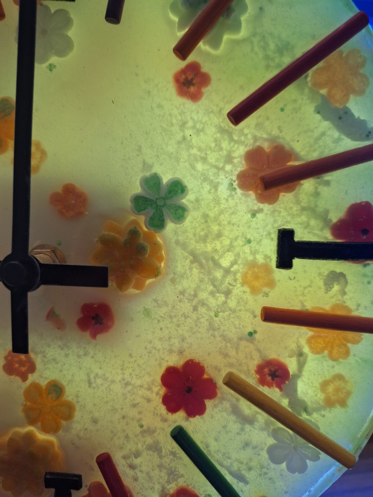 Handmade Resin Art Wall Clock This 10in circumference, handmade, wall clock is a unique addition to any room. With a quartz movement powered by battery, it provides accurate timekeeping. The analog display type is easy to read, and the clock features a variety of designs and themes, including retro and lounge, floral and garden, and novelty. Crafted from resin, wood, and resin flowers, this clock is a one-of-a-kind piece that adds a touch of modern style to any space. It is a hanging wall clock that is battery-operated and features a quartz movement. Perfect for those who love design, fun and curiosity, this clock is a must-have for any Home. Great for a unique gift! Not Weatherproof Thank You For Looking!