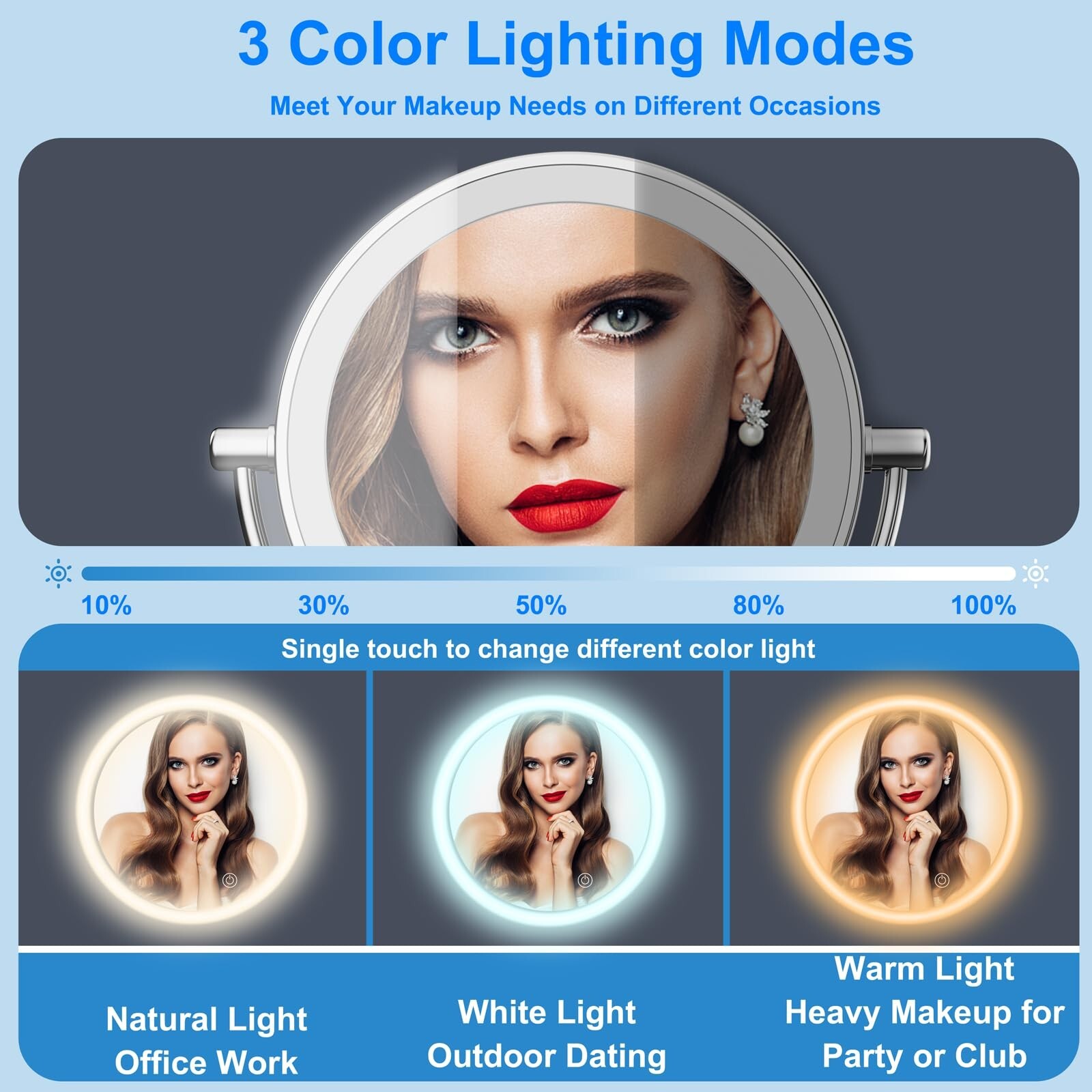 Wall Mounted Makeup Mirror with 3 Color Lights & Stepless Dimming, 1X/10X Magnifying LED Double Sided Shaving Cosmetic Mirror, Touch Sensor Extendable Arm 360° Swivel Bathroom Mirror Product Details Color: 10x Dimmable Chrome Brand: YMHSOLDR MPN: 3Color UPC: Does not apply EAN: Does not apply Brand: YMHSOLDR Room Type: Bathroom, Bedroom Shape: Round Product Dimensions: 13"L x 12"W Frame Material: Stainless Steel Brand: YMHSOLDR Room Type: Bathroom, Bedroom Shape: Round Product Dimensions: 13"L x 12"W Frame Material: Stainless Steel Style: Art Deco Mounting Type: Wall Mount Finish Type: Oil Rubbed Surface Recommendation: Metal Special Feature: 18 Months Warranty For Replacement & Lifetime Customer Service, 3 Color Lightning Modes & Stepless Dimming&Double Sided 10x Makeup Mirror with Light,360 Degree, Foldable, Magnifying, Double-sided Touch Sensor, Round Magnifying Mirror with Light Color: 10x Dimmable Chrome Theme: Space Specific Uses For Product: Makeup Number of Pieces: 1 Number of Items: 1 Material: stainless steel/glass/led light Frame Type: Framed Item Weight: 3 Pounds Assembly Required: No Frame Color: Silver Magnification Maximum: 10 x Manufacturer: YMHSOLDR Size: 13"L x 12"W Item Weight: 3 pounds Country of Origin: China Item model number: 3Color Date First Available: July 5, 2023 [8 Inch Hd Double Sided 1x/10x Magnifier]: The dual sided wall mirror is a big size and both sides with lights. The magnifying mirror with light is helpful for your makeup or daily life. The 10X side LED lighted mirror can zoom on your facial features when putting eyeliner, eyelash, lipstick and shaving,make sure that every detail of your hair and makeup are appropriate. 1Xmagnifying side is a standard mirror, designed for your overall look. [3 Color Lighting Modes & Brightness Adjustment]: Our wall-mounted vanity mirrors have warm, cool and natural light as well as stepless dimming. You can adjust the lighting mode and brightness of the makeup mirror according to the environmental conditions and makeup needs. Short press to change the color of the light, long press the switch to adjust the brightness of the light. Warm light for parties; cool light for meetings or daily work; and natural light suitable for outdoor activities. [360Rotation & 13Inch Extendable Mirror Arm]: The multiple joints of the wall-mounted makeup mirror can be adjusted any angle you need for easy fog-free viewing. The mirror frame, column, and base are made of metal, which is very durable. The flexible mirror arm can be freely extended so that the magnifying mirror can be adjusted to the right viewing angle and distance, allowing you to freely apply makeup, shave, comb your hair, etc. When not in use, it can also be folded up to save space. [Super Bright Light & AC Plug Powered]: This wall-mounted plug with lighted makeup mirror has 54 pieces of bright LED lights built in and can be powered by connecting directly to AC power. With no visible flicker and a stable light source, this amazing LED makeup mirror can illuminate your beauty when you need it, so don't worry about a lack of light. Mirror will turn off after 30 minutes, so even if you forget to turn off the light, you don't have to worry! [EASY INSTALLATION & 100% SATISFACTION]: This makeup mirror wall mount with led light is suitable for bedroom, hotel and bathroom. It is easy to install, please check all the accessories before installation! We also explain every detail in the video and instruction manual. For any reason, if you are not satisfied with your purchase, we offer a 100% 60-day refund & 18-month warranty guarantee! Just feel free to contact us.