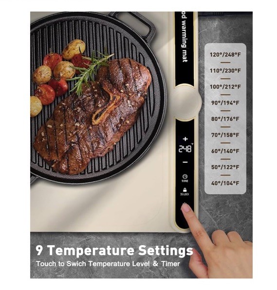 The NewHome Warming Mat for Food is a beige electric warming tray made of silicone, designed for buffets or parties. With a size of 38*80*2.1cm/14.96*31.49*0.82in, this warming tray is perfect for keeping dishes at the ideal temperature while keeping your table clear. Its sleek design and practical use make it an essential addition to any gathering or event.
