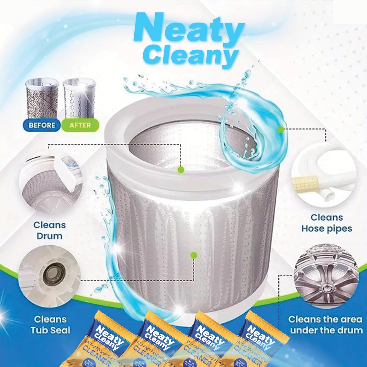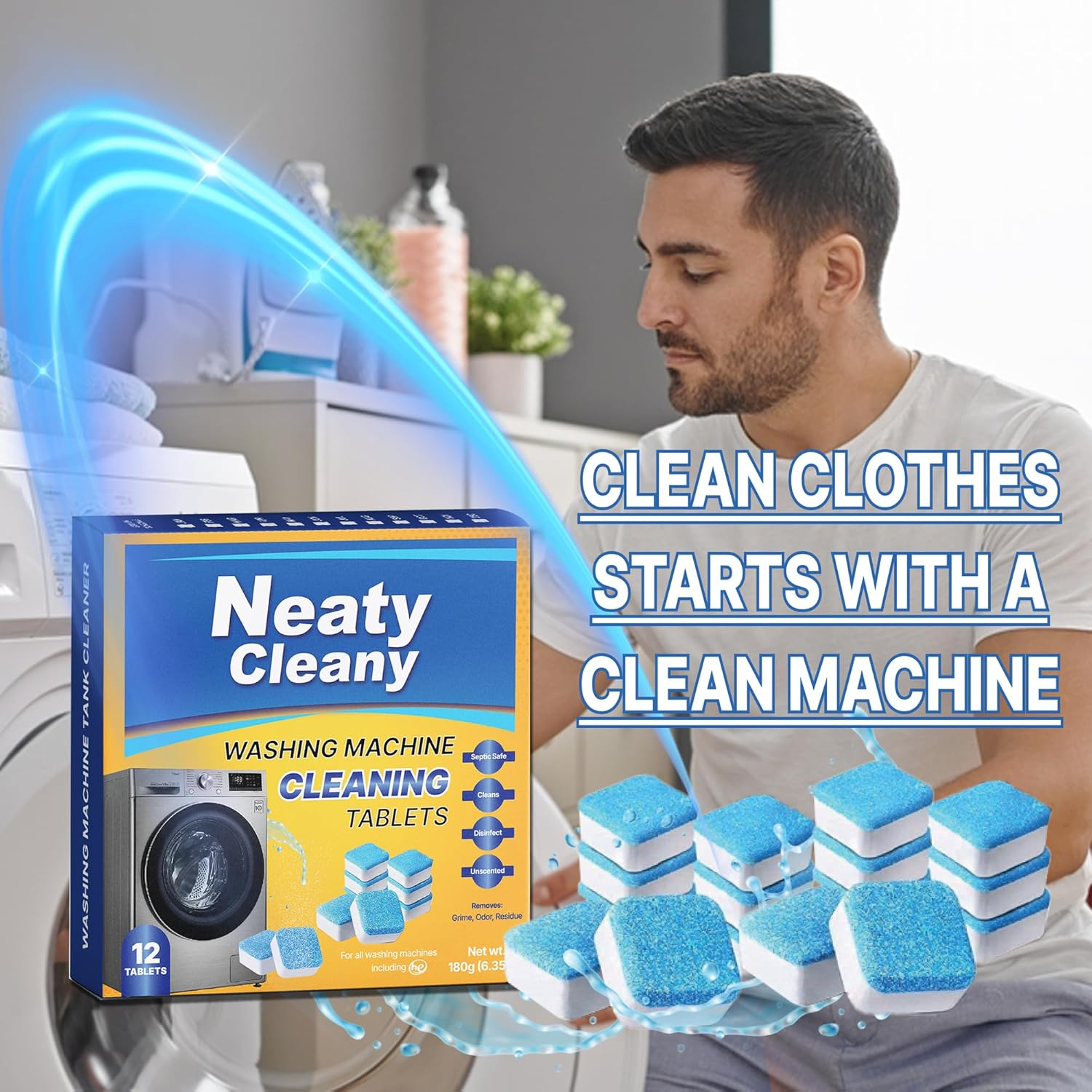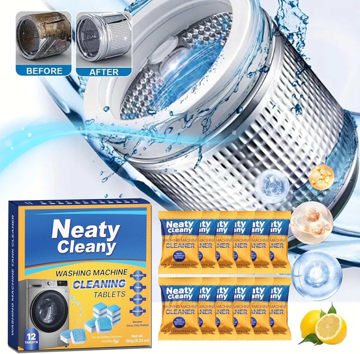 Powerful washer Machine Cleaner Tablets : Our tablets tackle stubborn residue, mold, and mildew etc. Fresher Laundry: Our Washer Cleaner formula Eliminate lingering odors for a delightful laundry experience Easy to Use: Drop a tablet into an empty machine and run a Cleaning cycle Safe for All Machines: Suitable for front-loaders, top-loaders, and high-efficiency washers. Washing Machine Cleaner Front Loader / Top Loader and HE washers Extend Appliance Life: Regular maintenance prevents costly repairs We care about the environment. Our tablets are septic-safe and biodegradable. Effective Cleaning: Our tablets dissolve quickly, penetrating hidden parts of your machine to remove buildup and prevent clogs. “Revitalize Your Washing Machine with Our Premium Cleaner Tablets!” “Tired of musty odors and lingering residue in your washing machine? Our advanced cleaner tablets are here to help!” Key Features ” Deep Cleaning Formula: Dissolves buildup and grime. Odor Elimination: Leaves your machine smelling fresh. Effortless Maintenance: Simply drop a tablet and run a cycle. Extend Machine Lifespan: Regular use prevents wear and tear. “Experience the difference—say goodbye to funky smells and hello to cleaner laundry!” “Experience the difference—say goodbye to funky smells and hello to cleaner laundry!”