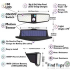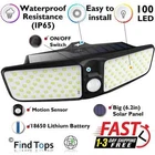 Waterproof 100 LED Solar Powered Light Outdoor PIR Motion Sensor Garden Security FindTops Waterproof 100 LED Solar Powered Light Outdoor PIR Motion Sensor Feature: 1. Super Bright: With 100 Leds and 270° wide light angle, the outdoor solar lights will greatly enhance the brightness. Providing a super bright illuminance for a widely area. 2. Auto ON/Auto Off: The LED solar lights will be automatically turn on in night when the PIR sensor detects the motion, and will be turn off after 30 seconds if no motion detects. No need to turn the switch on or off, it will automatically work at night after fully charged. 3. IP65 waterproof and durable: Waterproof coefficient of IP65. No fear of dust and rain in outdoor. The solar light works very bright even in extreme weather conditions. 4. Unique Two-sided Illumination Design: With two-sided offers wider range illumination, the LED on both sides provide enough extra light. It provides your illumination for security and safety protection. Technical Specification Waterproof 100 LED Solar Powered Light Outdoor PIR Motion Sensor . Material: ABS + PC Impact resistance and Thermal resistance. Led Quantity: 100 SMD Provide high brightness and reliability. Lighting area: 538FT2 270° wide light angle, supply a super bright illuminance for a wide area. Detecting Angle: 120° Motion Sensor The special design of the sensor provides a large angle of motion detection. Sensing Range: 23ft Enhanced sensor detects movement at a distance of 23ft Light source: White Light Provides great visual brightness. Switch: ON/OFF Pinhole Switch Hidden switch. Prevents unauthorized switching OFF. Solar panel power: 0.9W, 5.5v Big (6.2in) Solar Panel (Solar Energy Charger) Battery: 18650 Lithium Battery 3.7v 1800-2200mAh* (Depends on battery discharge level) 16000+ Hours Lifetime, Charging time 8 hours, Working time 6-8 hours. Protection level: Waterproof - Resistance (IP65), Heat - Resistance, Frost - Resistance No fear of dust, sun, rain and snow. Works even in extreme weather conditions. Installation: Fast installation. Easy to install. One attachment point. No Need to Plug to Charge the Battery (No cables). Dimensions: 9x16x2.7in , 8.4oz. Package List: 1 x 100 LED Solar Wall Lights 1 x Mounts set (Expansion Pillar-hinge + Screw) 1 x User manual and Instructions for installation 1 x Pin (For hidden inclusion) Test Results Products with the FindTops status undergo laboratory quality testing. Protection Level Test: IP65 (Dust-tight, Water jets) Dust-tight: No ingress of dust. Complete protection against contact (dust-tight). Test duration of up to 8 hours. Water jets: Water projected by a nozzle (0.25 in (6.3 mm)) against enclosure from any direction shall have no harmful effects. Test duration: 1 minute per square meter for at least 3 minutes. Water volume: 12.5 litres per minute Pressure: 30 kPa (4.4 psi) at distance of 9.8 ft (3 meters). Accelerated Test Methods Simulating Atmospheric Aging: Tested at 140 ºF (60 ºC). At a humidity of 21.5% Accelerated aging is understood as a cyclic effect on adhesive joints together or separately of humidity and temperature in a wide range, approaching the operating conditions of products in atmospheric conditions. Test results table: Test 6 samples by 6 parameters. The tests were carried out from six randomly selected samples. Contact us We can be contacted at any time through eBay messages if you have any questions, comments or product requests. We will respond to you within 24 hours and do our best to help you out! We encourage our customers to contact us with any questions or concerns! We'd like to be sure you are completely satisfied with your purchase. Payment We only sell on eBay, so you must pay via eBay's payment processing system. Your payment is covered by the eBay Money-Back Guarantee. Shipping Please note that specific areas may experience delivery delays based on local conditions. Delivery speed by 1-3 days, with some delays stretching up to 5 days. PlatinumMart