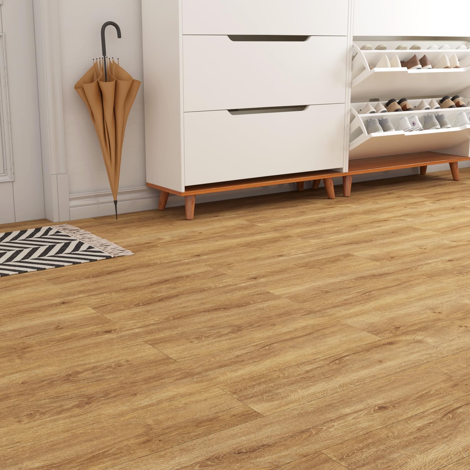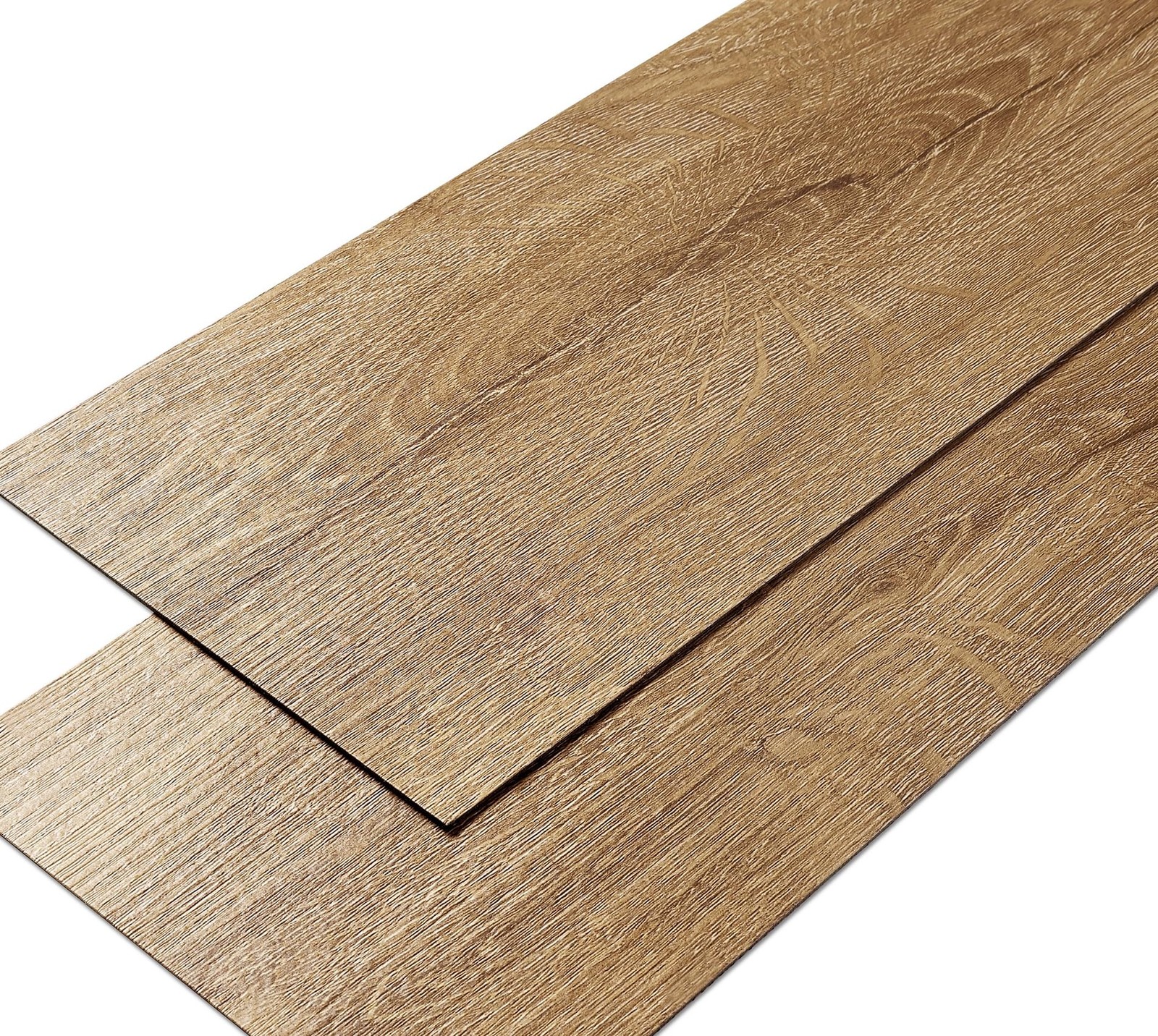 PEEL AND STICK FLOOR TILE WOOD FLOORING TILE FLOOR 👍 Would You Want To Quickly Transform or Decorate Your Home? 👍 ▸ Peel and stick floor tile is extra thick and durable. ▸ Wood flooring peel and stick is matte and slightly textured. Wood grain design is suitable for bathroom, kitchen, basement, bedroom, laundry, living room, etc. 📝 SPECIFICATION 📝 Finish: Matte Feature: Peel and Stick, Self-adhesive, Waterproof, Oil-proof, Removable, Sticky, Thick, Durable, Repositioned, Easy to Clean, Easy to Use, Bubble-free. Application: Suitable for decorating and transforming kitchen, bathroom, floor, countertop, coffee table, vanity, cabinet, built-ins, walls, dresser, drawer, wrapping paper, DIY project, and more. ✂️ INSTALL STEPS ✂️ 1. Firstly, clean the surface to make sure it is smooth flat and dry. Measure the area, leave an extra length before cutting the flooring tile. 2. Secondly, Peel off the backing little by little while using a soft cloth to smooth the tiles as you go. 3. Finally, use a hairdryer to ""stretch"" the edges and seal them under the countertop overhang. 😀 WARM TIPS 😀 ▸To avoid color difference please buy enough boxes at a time to ensure they come from the same batch. ▸Product pictures may have slight differences in color from the actual product as monitors vary. ▸Please ensure that the covered surface is smooth and clean. Textured surface will affect the adhesion of the peel and stick floor tile. ▸Please contact us through Amazon if you are unsatisfied with the vinyl flooring peel and stick for any reason, and we will solve it in the first time. 🦖 -【Size】:The size of each peel and stick floor tile is 6"x36". 36 tiles covers 52 sq.ft. 1 piece of wood vinyl flooring covers 1.45 sq.ft, Strong coverage and a variety of styles to choose from. 🦖 -【Features】:Peel and stick flooring is made of PVC with slightly texture. It is waterproof, oil-proof, removable. Easy wipe to remove stains and protect the floor from splashes and oil. 🦖 -【Easy to Use】:Laminate flooring are nice for new users and super easy to operate! Just peel the back film and stick it to the surface you want. no grout, no glue, and removable. Easy to cut with sharp utility knife or scissors. 🦖 -【Application】:Peel and stick floor tile waterproof can be arranged in a stack bond, subway, or herringbone and more pattern. Bathroom floor tile is great for bathroom, kitchen, basement, bedroom, laundry room, living room, garage, RV, fireplace, camper, and more. 🦖 -【Customer Service】:We are fully committed to 100% customers satisfaction, so if there is any problem with this peel and stick floor tile, please feel free to contact us and we will reply as soon as possible.