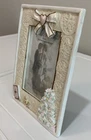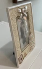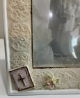 Display your cherished wedding memories in this lovely photo frame. The rectangular frame features an elegant design of lace, roses, bows, a cross, and floral patterns. Its white resin material adds a contemporary touch to any home decor, making it a perfect fit for your photo size of 3.5x5". This freestanding frame is suitable for a single photo and can hold a photo capacity of one. It's a great gift for your special moments that won't disappoint. Personalize it with your own touch for a unique feel. I found this item while Thrifting. I don’t think that it’s ever been used because it still has its original stock photo insert. Please see photos for more details. This item is ready to be shipped. Bin 12