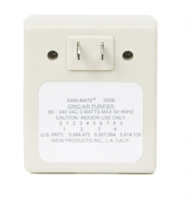 Wein AS250 WASHROOM IONIC AIR PURIFIER - SANIMATE AS250B Easy installation, just plug it in and for pennies per week this portable air purifier will operate continuously to reduce these airborne pollutants by up to 90%. A mini sanitizing/deodorizing breeze is emitted from the center of the grill. Since it is filterless, no maintenance is required other than checking periodically that the light is on indicating that dangerous microbial growth and odors are being controlled. It also features a small light to illuminate your way at night. Product Details Brand Wein Product Type Air Purifier Mpn SANIMATE AS250B Reduces airborne particles and germs. Silent, filterless, fanless, and maintenance free operation. Plug directly to wall outlet in your washroom. Outputs 1.2 trillion negative ions/cubic centimeter. Operates continuously for pennies a month. - Powered by