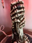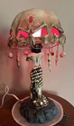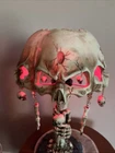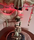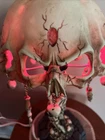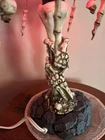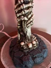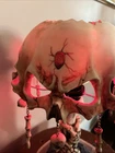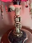 This unique table lamp from Wicked Skulls and Bones features a gothic style with a skull and bones pattern. The lamp is made of resin and has a faux antique finish. It measures 15 inches in diameter and comes with a white cord switch. The shade shape is a dome and it includes a lamp shade. The lamp is corded and has a voltage of 120 V. It is suitable for use in various rooms such as the study, porch, living room, and home office/study. The lamp is a rare vintage piece that will add a creepy yet chic vibe to any space.
