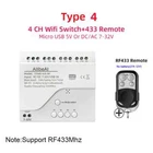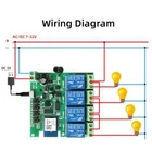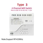Package Listing Type 1: 4 Channel Wifi RF433 Relay Type 2: 4 Channel Wifi RF433 Relay+RF433 Remote Controller Type 3 : 4 Channel Wifi RF433 Relay+Case Shell Type 4: 4 Channel WIFi RF433 Relay+Case Shell+RF433 Remote Controller Type 5: 2 Pieces RF433 Remote Controller,no wifi relay Type 6 2 Pieces RF433 Remote Controller,no wifi relay Use For 1.Remotely give a pulse signal to turn on and turn off Lights,Lamps and other home appliance. 2.Remotely give a pulse signal to turn on and turn off Garage Door,Door Access 3.Remotely give a pulse signal to control DC Motor,AC Motor to Forward and reverse Overview Type 1,2 The RF433 remote controller (receiver) don't include battery battery type;27A 12V,The picture of the battery is in the end of the page. The WIFI module can be controlled by fix code EV1527 RF433 remote controller,and it can't controlled by rolling code remote controller. Note The relays is passive output(dry contact), No matter how many power you supply in the input, the output don't have any voltage, you also need to supply power in output. The power supply in the input just can make PCB board work.if you do not supply power in output, the connectted device can't work. 3 Working Modes 1.Self-locking : each channel could be switched on/off seperately.You also can turn on/turn off all channel at the same time. 2.Interlocking mode : Switch on any channel , other channels will be switched off automatically . 3.Inching mode(jog mode) : Switch on one channel,the channel will be automatically closed after 0.5 seconds .Other channel is same as the channel. If you need to change the mode,you need to press the mode button or active other working mode in the app. How to Change the Inching Time If you need to change the inching time. You need to press the mode button to enter into self-locking mode or interlocking mode,so you can change the inching time on the APP. The inching time only available in the self-locking or interlocking mode) The time range is 2-3600 seconds. Features: 【Two Input Ports】 You could choose USB 5V port or the screw terminal port to supply power in the input to make the pcb board board work. 【Dry Contact/Passive Output】 No matter the power you supply in the input, the output don't have any voltage If you do not supply power in output port, the connectted home appliance can't work, you also need to supply power in output. 【Timer】 The connectted home appliances can be automatically turned on/off according to the time schedule. Each channel can set different time schedule. Different Ways to Control the WIFI Module 【APP Remote Control】 You can control the connectted home appliance in Tuya or smart life APP anywhere and anytime.Such as light, electric kettle, electric rice cooker, electric curtain, etc. 【RF433 Control】The WIFI Module support RF433 Frequency,and you can control the WIFI module by RF433mhz remote controller. 【 Mobile Phone Control】 When you go outside or at home,You could control the module in your smart phone by 2.4Ghz WIFI or 2G/3G/4G Mobile Network. (Note:The router need to online and the WIFI module need to keep a close distance with the router) 【Voice Control 】 Compatible with Alexa and Google Assistant, you can use the voice control to turn it on/off the connectted home appliances . 【Share Control】 One device can control by Multiple phones,you can share the wifi module with your family member. 【Group Control】 one phone can control Multiple smart device.You can add the wifi module and other smart device in a group,and then turn on/off all smart device at the same time. 【Scene Linkage】 Creating smart scene to trigger ON/OFF all WIFI smart home appliances by departure mode, home mode, temperature, humidity, or other conditions. Description: Input1: USB 5V Port Input 2 :(screw terminal port): DC/AC 7-32V Output:Passive Output(Dry contact) Working frequency: 50-60Hz RF433 Frequency Working temperature: -20-70℃ Wifi standards/ protocol :IEEE 802.11b/g/n, WIFI 2.4Ghz Total load power(Output): 2000W/10A/gang Max Load(Output):3500w/16A/4 gang Max current(Output):`10A Size: 75*73*20 mm APP Remote Control You can remote turn on/off household appliances and set timing schedules to turn on/off the household appliances via app Tuya/Smart life anywhere anytime. such as lights, celectric curtains ,electric curtains fans. so you can enjoy an high-tech life. Timer Via app,you can set time schedules to automatic turn on/off the household appliances , such as lights, celectric curtains ,electric curtains fans. so you can enjoy an high-tech life. Case(Shell) Included Type 3 and type 4 include case(shell),and you can use it in different environment. Product Detail Wiring Diagram for Light/Lamp Wiring Diagram for RF433 Remote Controller Wiring Diagram for AC/DC Motor Only one motor can run each time. You can't run two motor at the same time. If you need to connect two motor at the same time, you can set interlocking mode to make sure only one motor to run each time. Wiring Diagram for Door Access Wiring Diagram for Electric Motor Lock The Electric Motor Lock must have K-, K+, GND, +12V ports. 2. K+ must be connected to the 12V port How to pair RF433 remote controller with with the devices. 1.Press the RF433 pairing button for 4 seconds,and wait until the blue led indicator turn on. 2.press any key of RF433 remote controller, and then you can pair the channel with one key of RF433 remote controller successfully If you need to pair other key of the RF433 Remote controller and other channel, you need to repeat the step. How to clear the pairing RF433 remote controller with with the devices. 1.Press the RF433 pairing button for15 seconds,and wait until the blue led indicator turn off. If you need to clear the pairing between other key of the RF433 Remote controller and other channel, you need to repeat the step. Battery of RF433 Remote Controller(Not included)