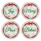 As fall turns to winter, bright holly berries make their appearance. The Winterberry collection is the holiday classic that brings this timeless motif to life in elegantly sculpted dinnerware and serveware, beautiful glassware, and joyous giftware. Each salad plate in this set of 4 features red ribbon framing a unique holiday sentiment: Merry, Peace, Believe, and Joy. Made of stoneware for long-lasting beauty with a traditional scalloped-edge design, these plates will be enjoyed at all your Christmas gatherings for years to come. Set of 4 salad plates, each measuring 8 inches in diameter by 1-inch high. Microwave and dishwasher safe. TIMELESS HOLIDAY MOTIF: Winterberry celebrates the holly leaves and berries that make their appearance each winter and are an iconic symbol of the Christmas season UNIQUE SENTIMENTS: each salad plate features red ribbon framing a unique holiday sentiment: Merry, Peace, Believe, and Joy BEAUTIFULLY CRAFTED: made of durable stoneware for long-lasting beauty with a classic and elegant scalloped-edge design SET OF 4: each salad plate measures 8 inches in diameter by 1 inch high EASY CLEANING AND REHEATING: dishwasher safe for fast, simple cleanup, and microwave safe for quick reheating