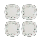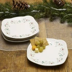As fall turns to winter, bright holly berries make their appearance. Winterberry dinnerware by Pfaltzgraff is the holiday classic that brings this timeless motif to life in elegantly sculpted dinnerware and serveware, beautiful glassware, and joyous giftware. Perfect for casual entertaining throughout the holiday season, these white salad plates are made of durable stoneware and combine contemporary square shapes with classic design. Scalloped edges are highlighted with festive green trim, and the plates are framed with a Winterberry garland, adding seasonal charm to your tabletop display. Set of 4 salad plates, each measuring 8-1/4 x 8-1/4 inches. Microwave and dishwasher safe. . SEASONAL SALAD PLATES: white plates are framed with a Winterberry garland, adding holiday charm to your tabletop display CLASSIC MEETS CONTEMPORARY: square plates feature traditional scalloped edges with festive green trim SET OF 4: each plate measures 8-1/4 x 8-1/4 inches DURABLY MADE: crafted of stoneware for long-lasting quality EASY REHEATING AND CARE: microwave and dishwasher safe
